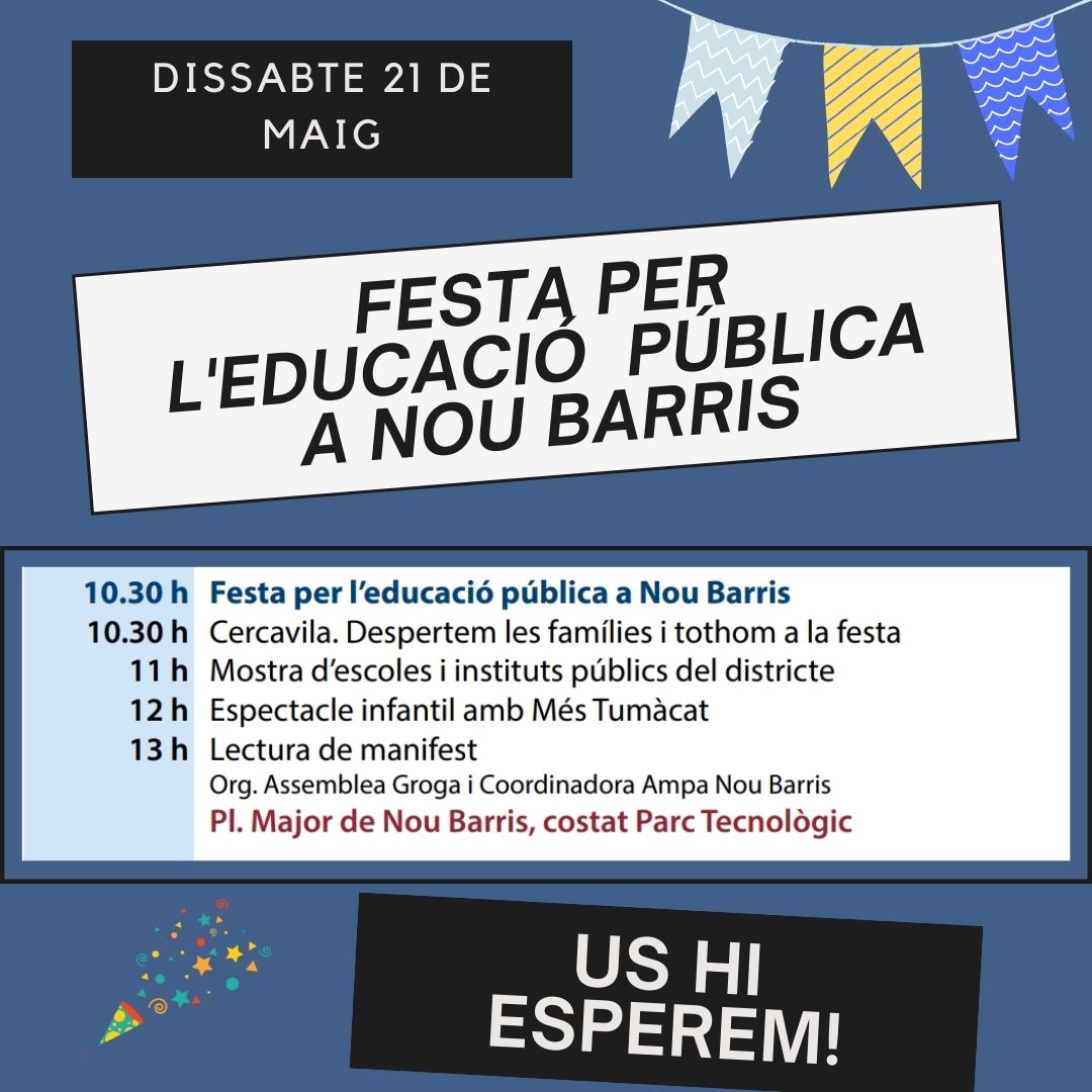 Dissabte us esperem a partir de les 11 a la festa per a l’escola pública al la plaça de l’Ajuntament per tal de gaudir d’una trobada de totes les escoles públiques del barri on hi trobareu diferents activitats adreçades als infants.