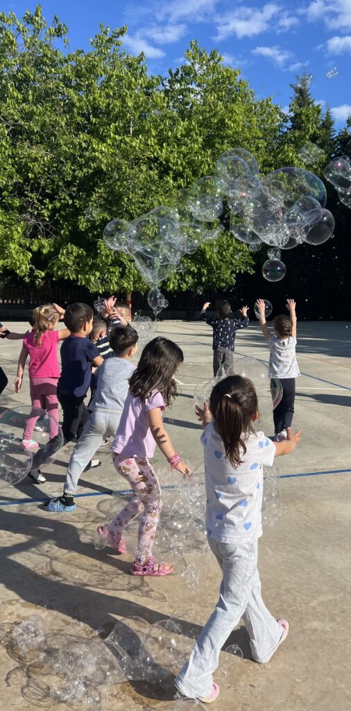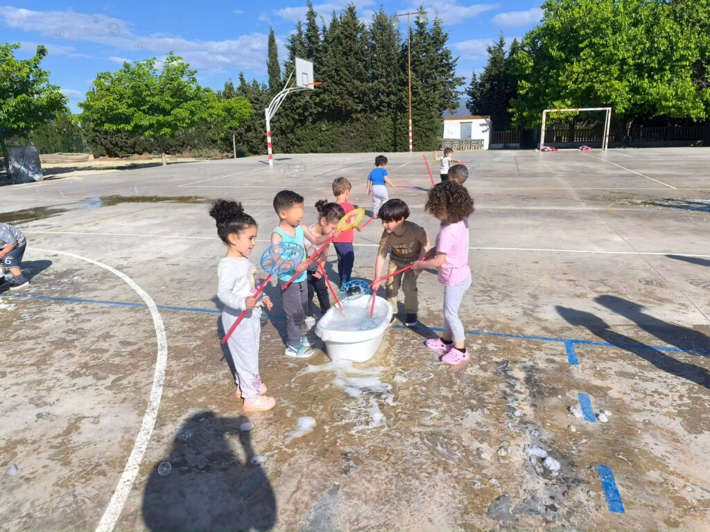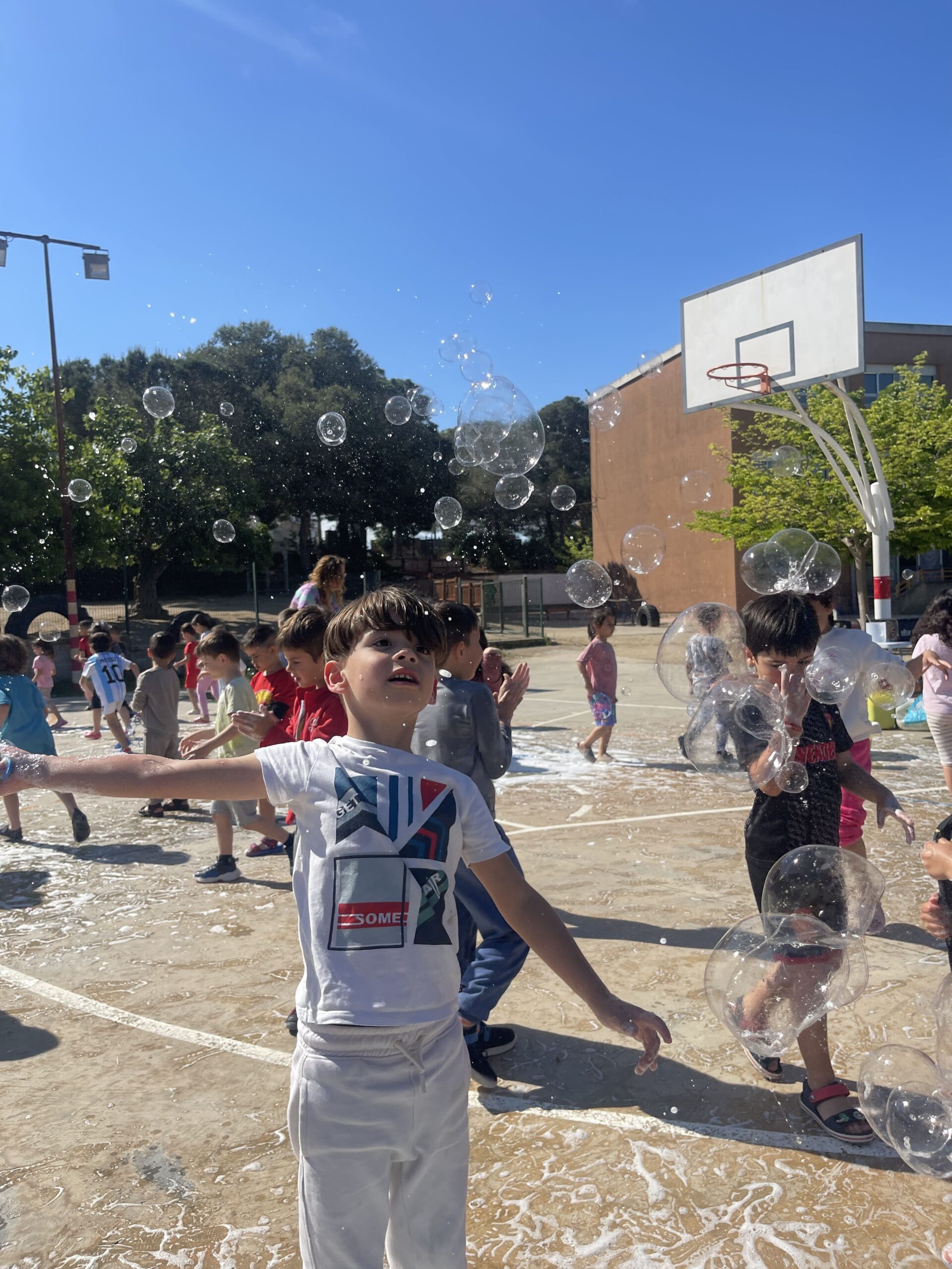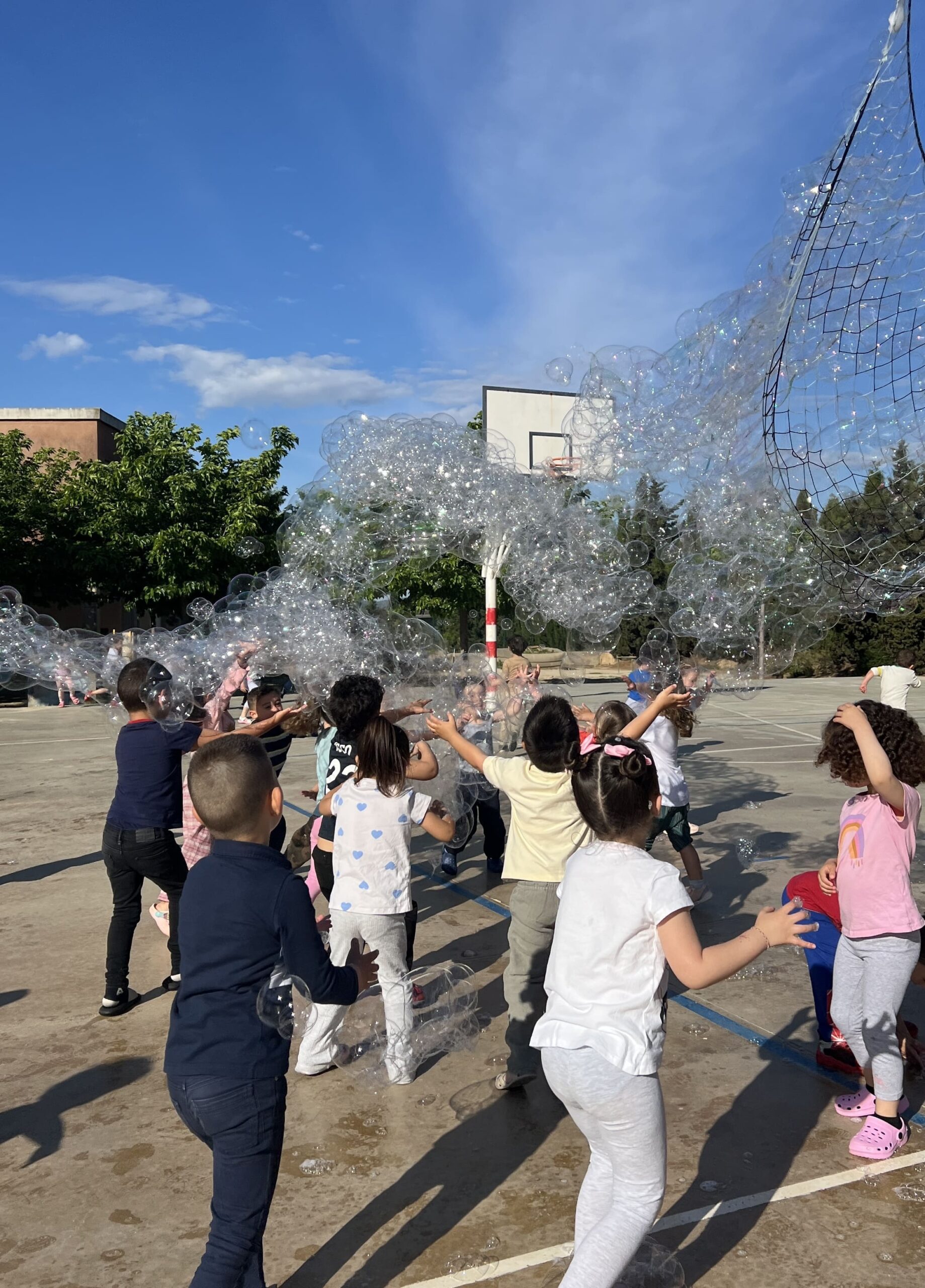 Els infants d’educació infantil hem participat en un taller de bombolles de sabó. Hem gaudit molt experimentant amb bombolles petites i difícils d’atrapar, també gegants. Hem pogut ficar-nos a dins!!!!!! Altres eren de fum…