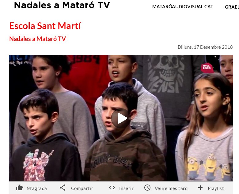 Us volem recordar que TV Mataró emetrà les nadales interpretades pels i les alumnes de cinquè del nostre centre demà dimarts 17 de desembre a les 21,30. Podreu accedir clicant a la imatge o bé al canal 24 de la TDT (TV mataró). Recordeu que un cop emeses les podeu recuperar en el següent enllaç:
