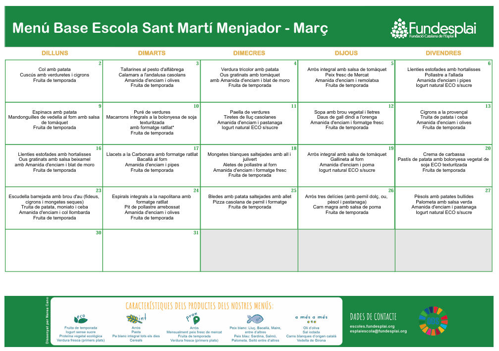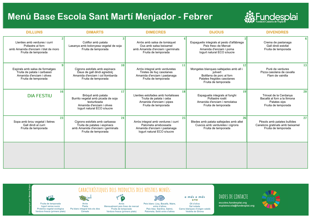 La nostra escola disposa de cuina pròpia i ofereix un menjar de qualitat per al seu alumnat. Prepara dieta especial quan és necessària temporalment per motius de salut. Atén al·lèrgies i intoleràncies alimentàries. Els menús són variats i dietèticament equilibrats.