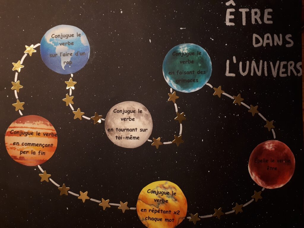 26/01/22Les élèves de cinquième et sixième travaillent la conjugaison du verbe ètre de manier ludique. Ils doivent être les premiers à avoir visité toutes les planètes et remplir une phrase lue sur une carte avec le verbe ou ajuter le pronom manquant.