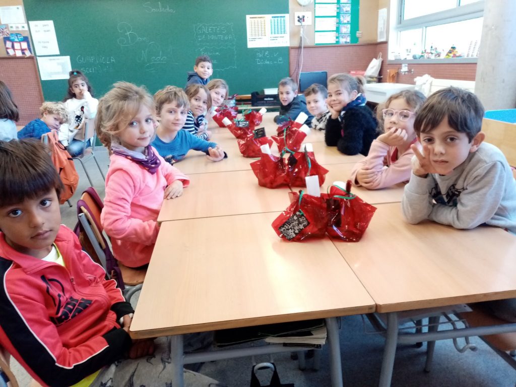 Els nois i noies de segon hem fet galetes de mantega amb formes nadalenques. Hem estat mesurant els ingredients, hem amassat la massa i després de deixar-la reposar a la nevera, hem fet les formes i les hem portat a la cuina de l’escola per enfornar-les.
