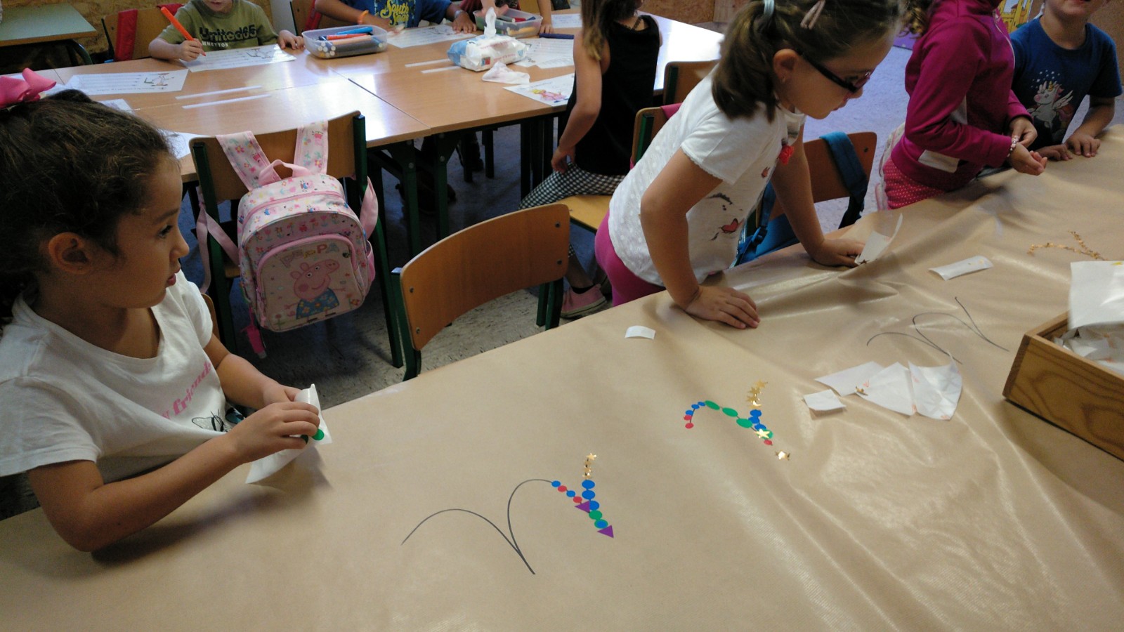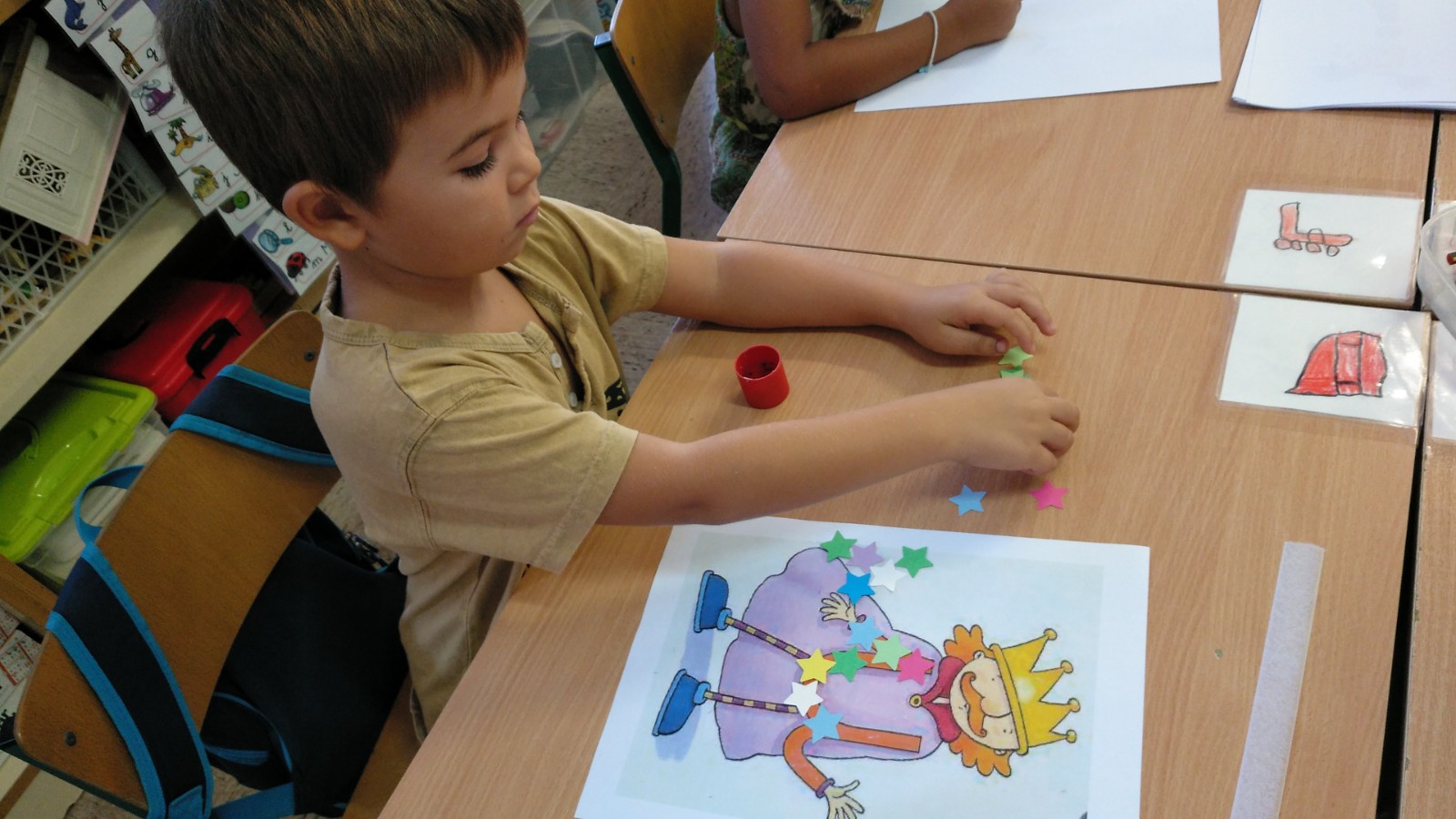 A l’aula estem aprenent les lletres lligades. Cada setmana o dues, arriba una lletra a l’aula i en visualitzem el conte. Cada lletra és un personatge de “La terra de les lletres”, un país on hi viu una família reial (les lletres vocals) i d’altres personatges del regne amb diferents oficis (les consonants). En aquestes fotografies treballàvem les grafies de la “i” i la “u”. La “i” és la princesa més petita i la “u” és el rei. Després de veure els contes en vam treballar la grafia en diferents formats.