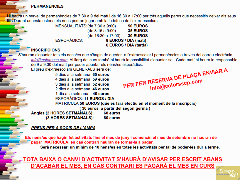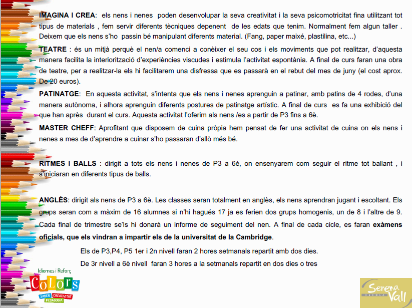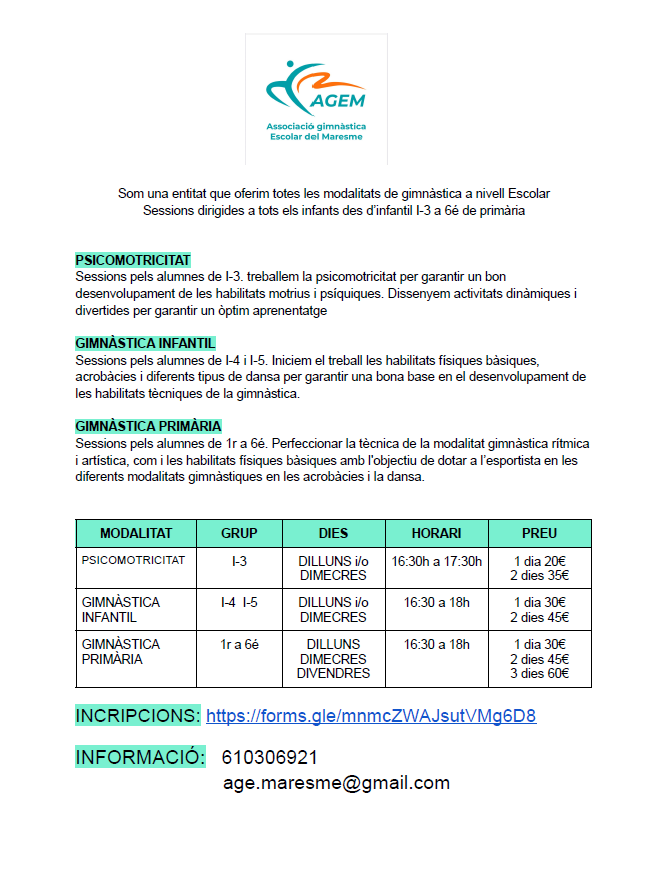 Extraescolars curs 2025-26 SECCIÓ ESPORTIVA INSCRIPCIÓ COLORS: menjador, permanències, extraescolars INSCRIPCIÓ ESCOLA DE MÚSICA GIMNÀSTICA RÍTMICA ROBÒTICA INFORMACIÓ I INSCRIPCIÓ