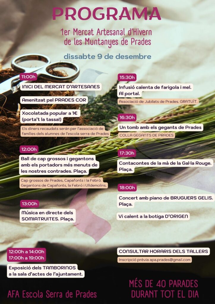 MERCAT ARTESANAL D’HIVERN Feu un comentari / Per Judit Roselló Morgades / 9 de desembre de 2023 / CALENDARI General / AFA, artesania, famílies, mercat Avui se celebra el Mercat Artesanal d’Hivern de les Muntanyes de Prades, organitzat per l’AFA de l’Escola Serra de Prades. Esperem que sigui un èxit de participació! Us compartim el programa tot seguit: