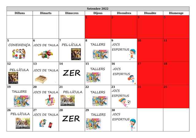 Aquest curs, com a novetat, iniciem el mes de setembre amb la jornada intensiva i les tardes de lleure educatiu. Us afegim unes fotos per tal que pugueu veure com s’estan desenvolupant les activitats, que són variades i entretingudes. També us compartim el calendari previst, que duen a terme la Júlia i la Txus.
