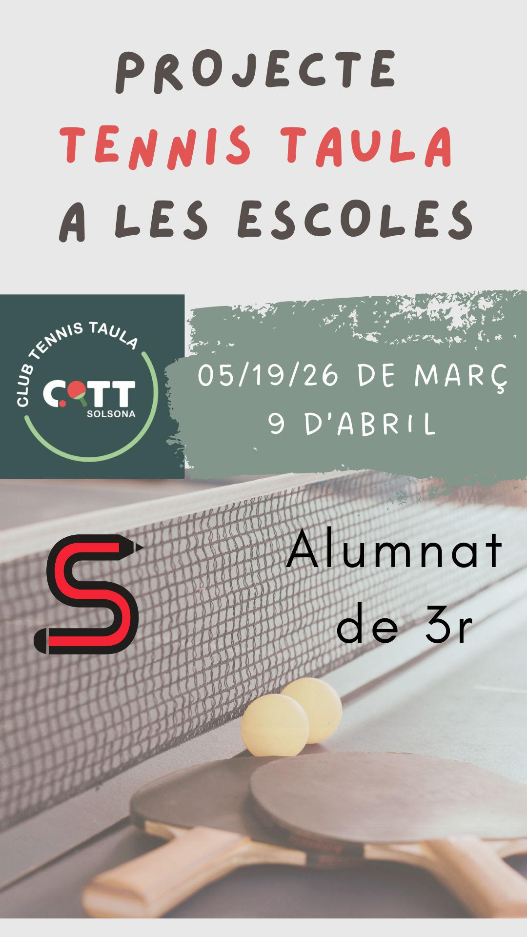 Es tracta d’una col·laboració amb una entitat local de recent creació, estem parlant del Club Tennis Taula Solsona, que vindrà durant 4 dijous al nostre centre perquè els infants de P3 s’iniciïn en aquest esport.