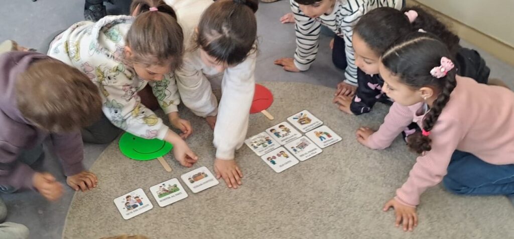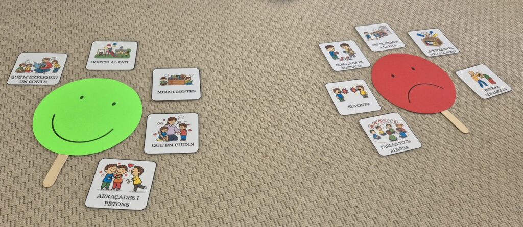A les aules d’educació infantil hem treballat a partir d’imatges que representaven diferents situacions habituals a l’escola: mirar contes junts, fer petons i abraçades, trencar joguines, espatllar el calaixet d’un company o companya, estirar els cabells, ajudar-se o compartir materials.