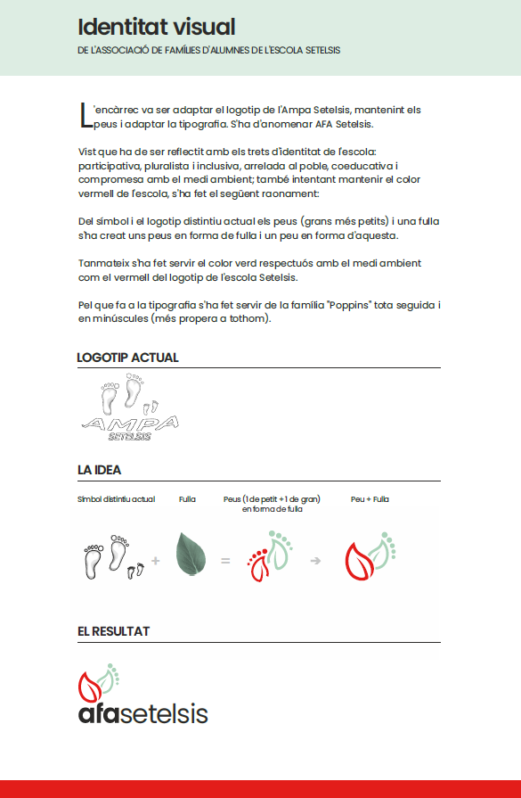 Nou logo AFA Setelsis admin22/06/21 Hola famílies, ja tenim nou LOGO! Us informem que dins del canvi de AMPA a AFA, ja disposem de nou logotip de l’AFA Setelsis, encàrrec que li vàrem sol·licitar a en Víctor Pallarès (pare de la escola) a qui li volem agrair la seva col·laboració.