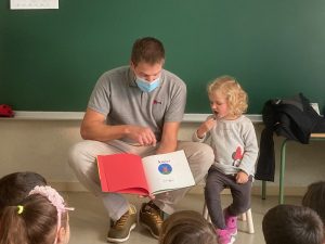 Aprofitant que la Nicole era la protagonista, el seu pare ens va visitar i ens va explicar un conte. Vam poder conèixer l’aventura d’un conillet que volia fer amics, i que aprenia a estimar tothom encara que fossin diferents de com era ell. Tothom va escoltar molt atentament el pare de la Nicole, i ens va agradar molt la història que ens va explicar.