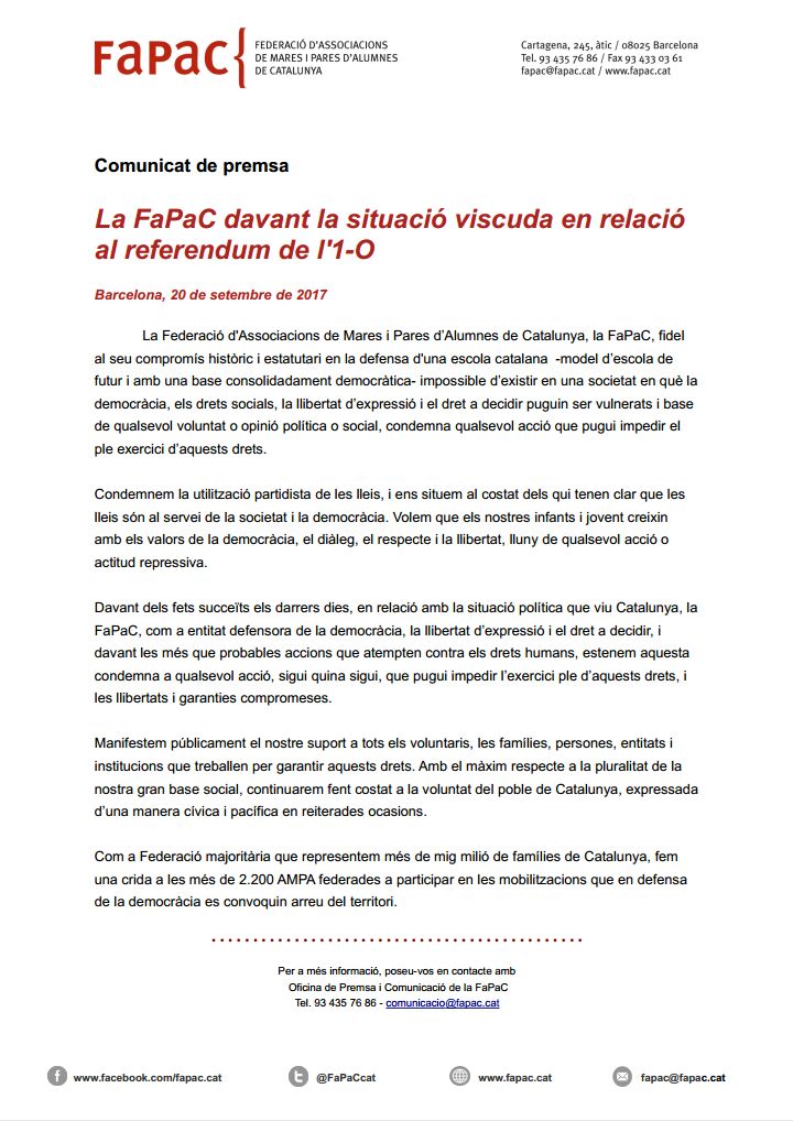 La FAPAC davant la situació viscuda en relació al referèndum del 1-O