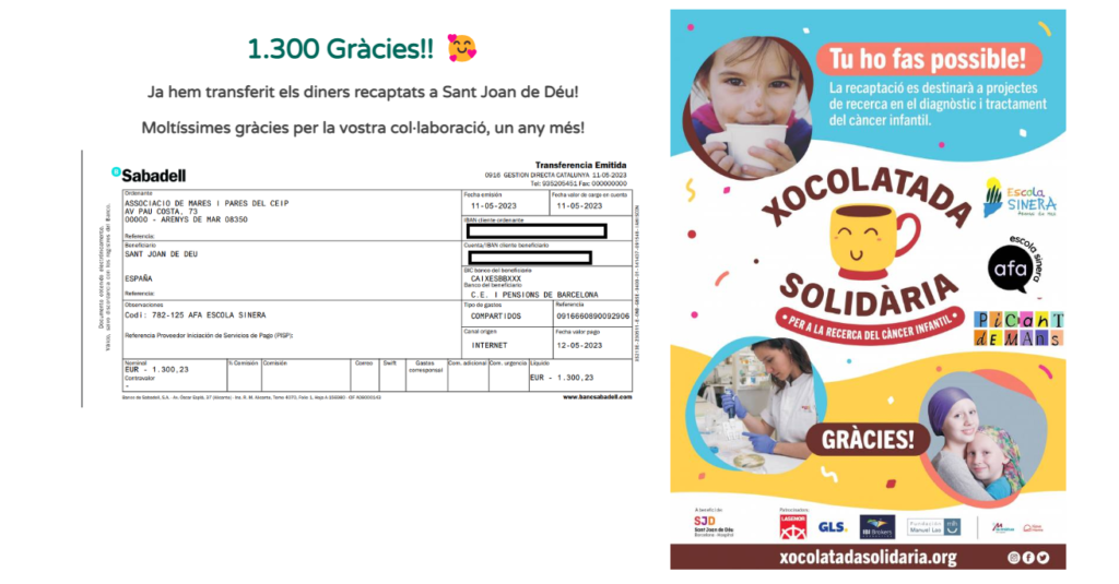 Famílies! Gràcies a tothom s’ha pogut recollir un total de 1.300€! Us estem molt agraïts a tots i a totes que ho heu fet possible. I per part de l’equip de mestres molt agraïts a l’AFA i a Picant de mans.