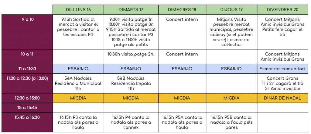 El Nadal ha arribat a l’escola i per això petits, mitjans i grans hem modificat l’horari de l’última setmana. Aquí teniu un recull de les activitats que farem les nenes i els nens de l’escola.