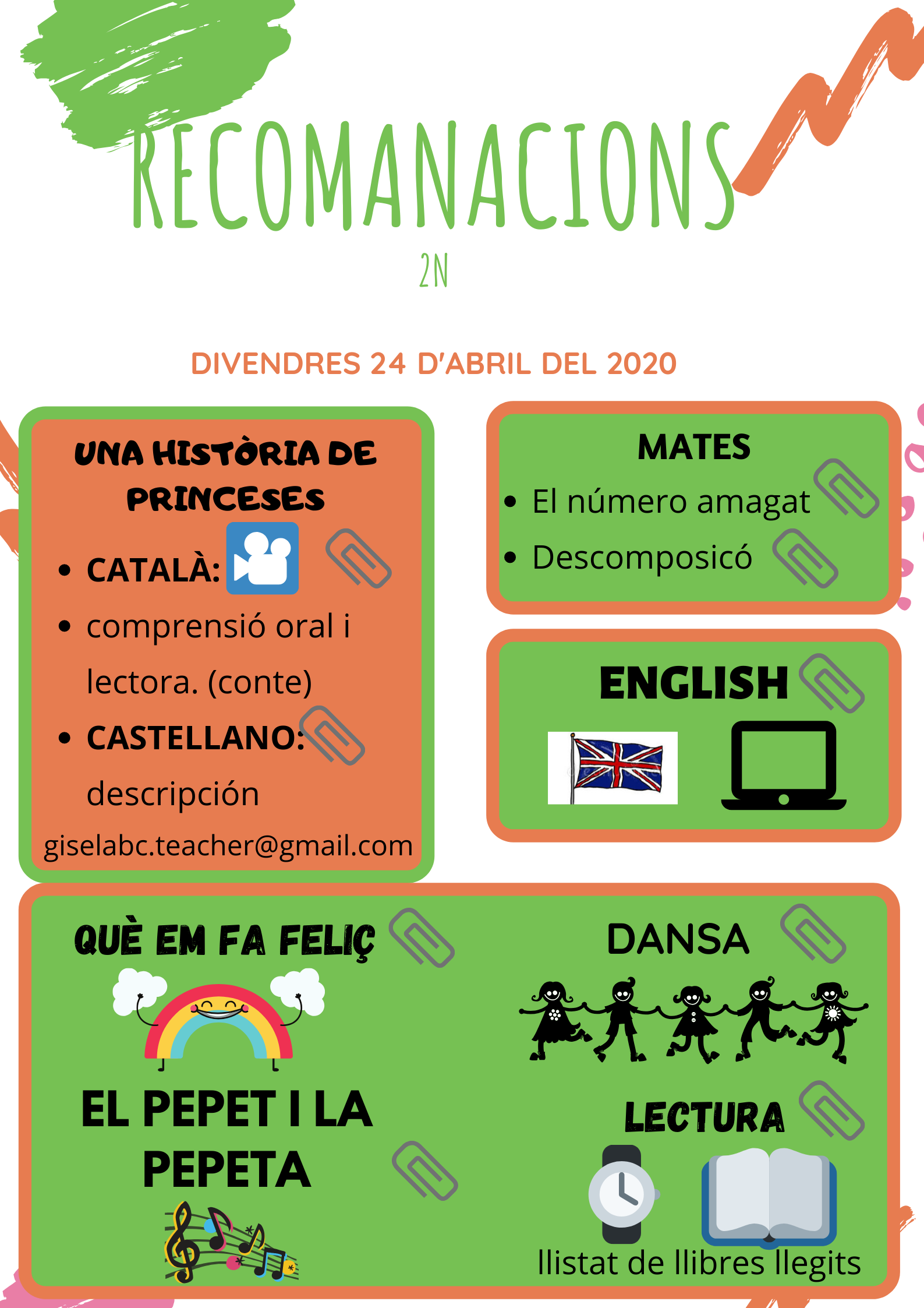 LES RECOMANACIONS PER A LA PROPERA SETMANA Feu un comentari / Per Escola Sobirans / 24 d'abril de 2020 / 2n / aprenem des de casa, cicle inicia, Segon Aquí podeu veure les recomanacions que us fem des de l’escola per a la propera setmana. Esperem que us agradin.