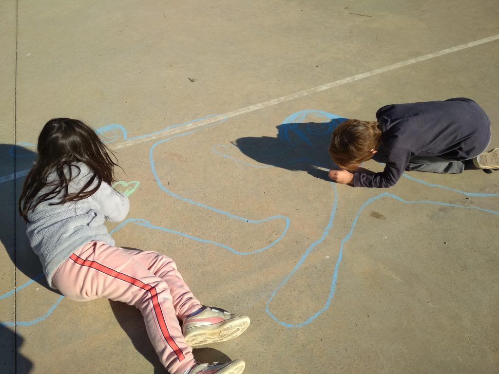 Seguim aprenent moltes coses del cos i aquest cop ho hem fet dibuixant-nos a terra. Ens ha agradat molt resseguir-nos amb els guixos de colors i poder observar les parts del nostre cos. També hem fet molts jocs a Educació Física per anar agafant consciència del cos i de totes les coses que podem fer:
