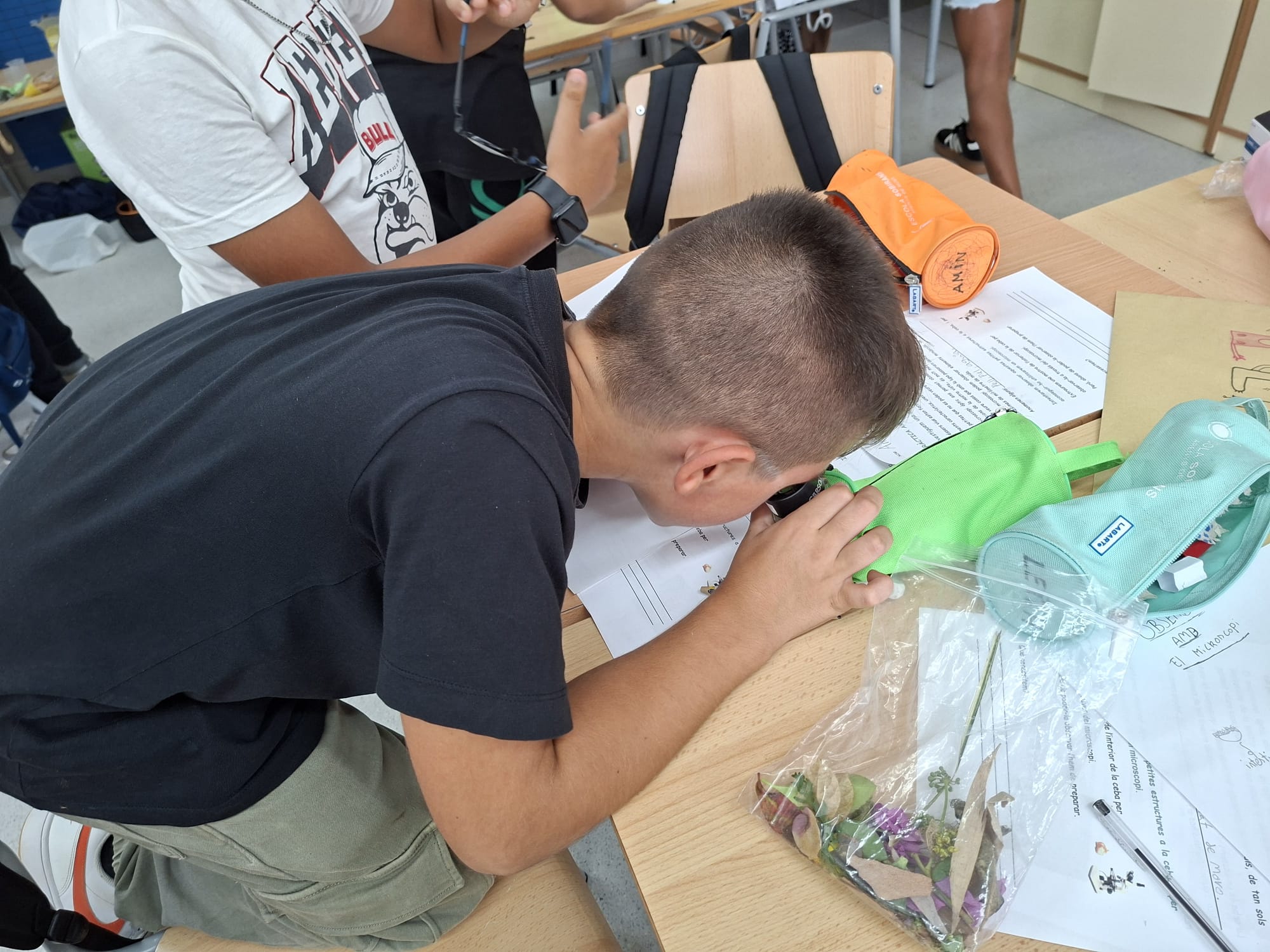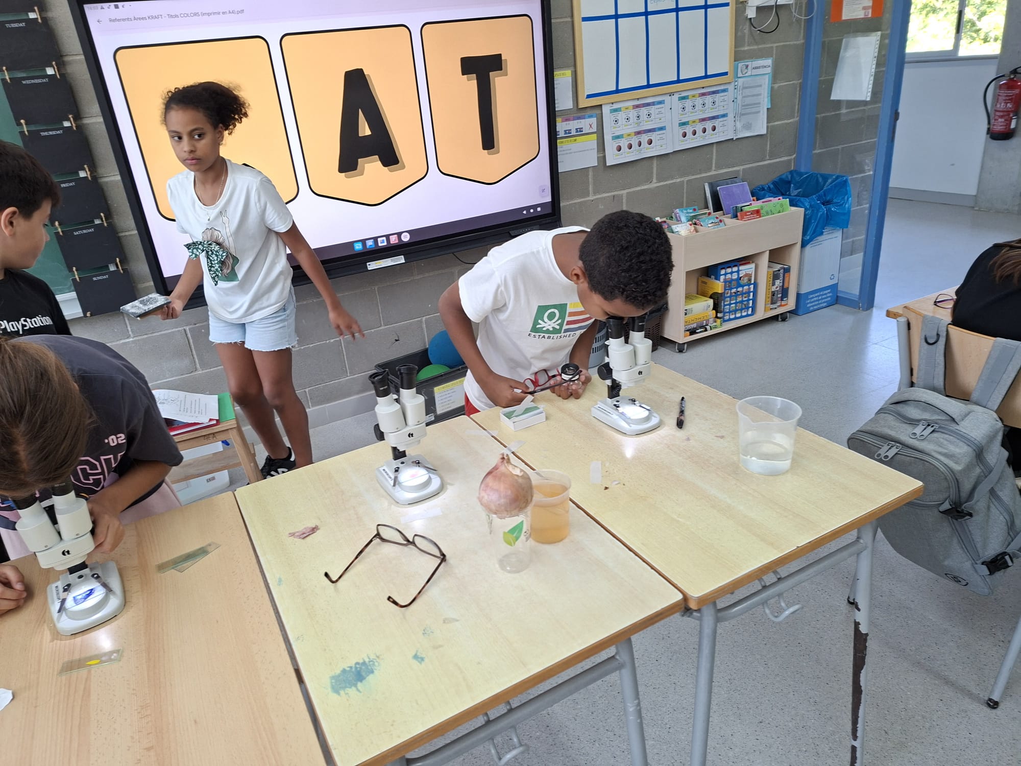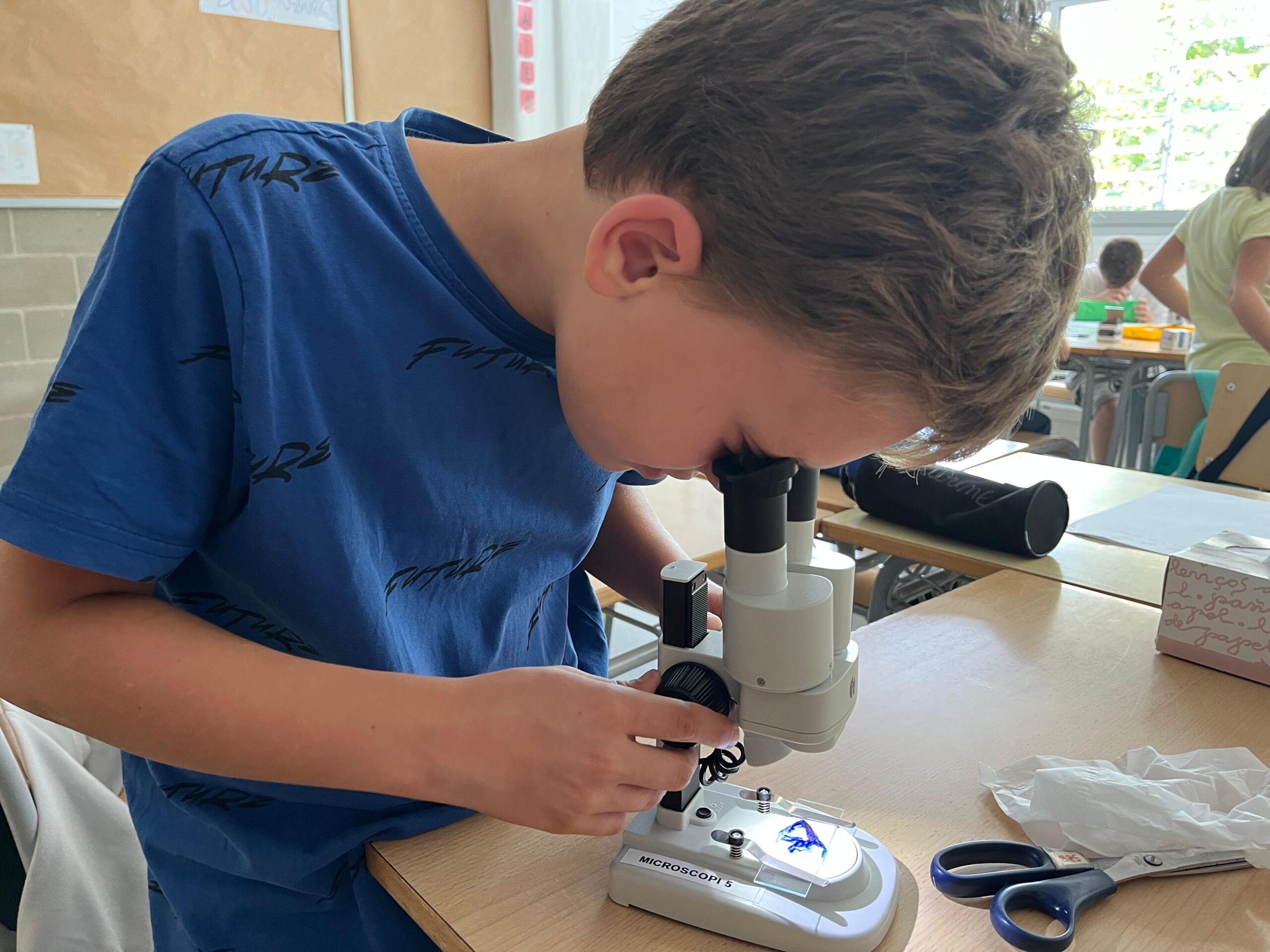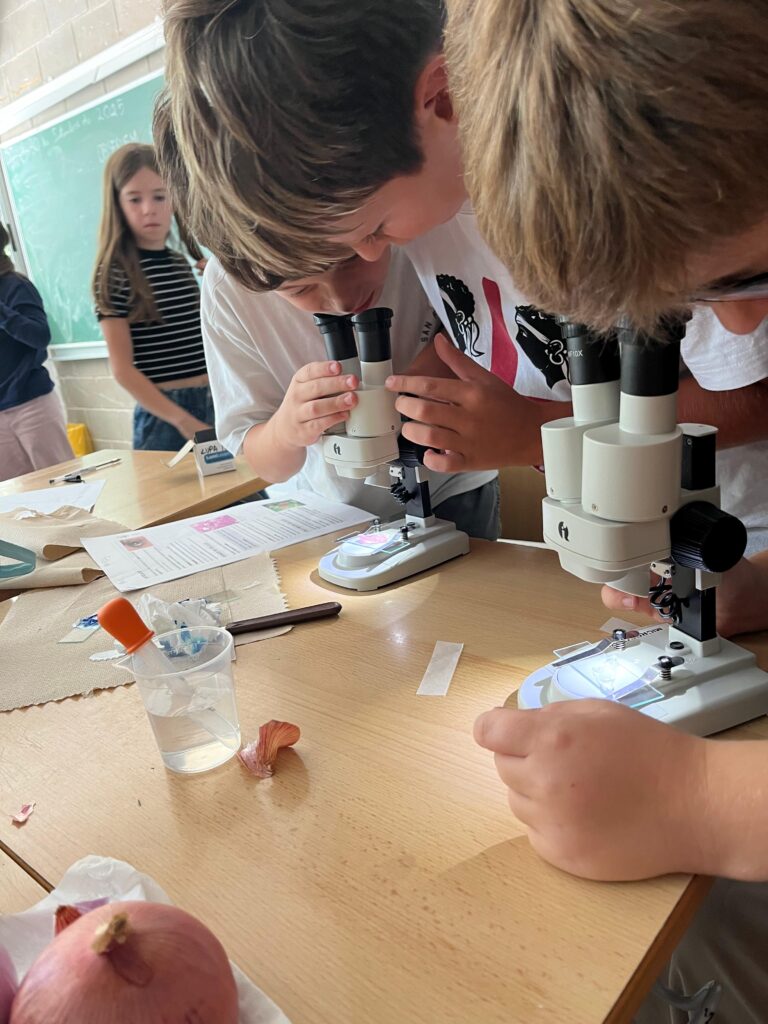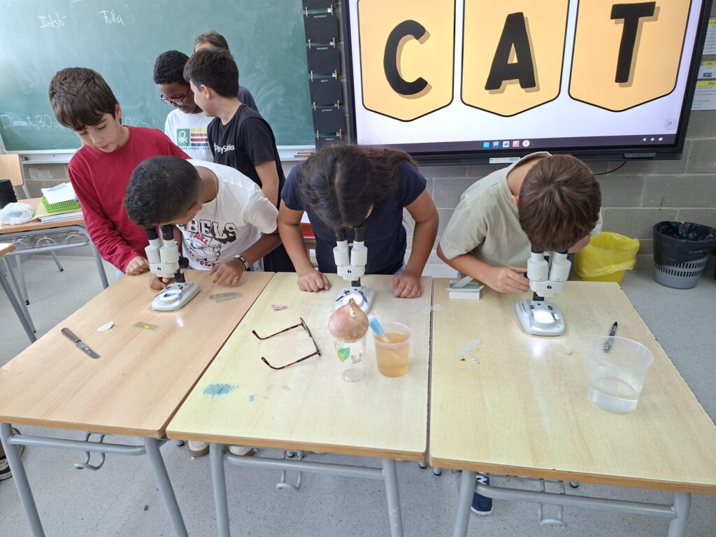 Els nens i nenes de 5è A i B treballem la cèl·lula. Avui hem fet de científics, i amb l’ajuda dels microscopis hem pogut observar cèl·lules de diferents éssers vius. N’hem identificat les diferents formes i colors. També hem après a fer un bon ús del microscopi i conèixer les seves parts.