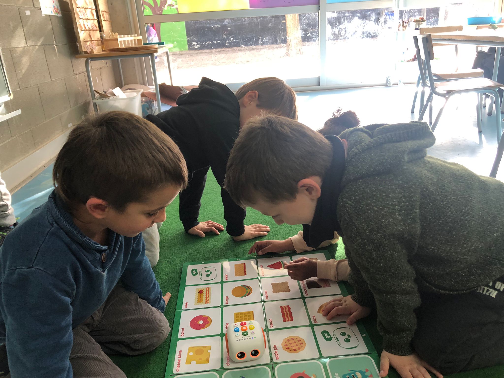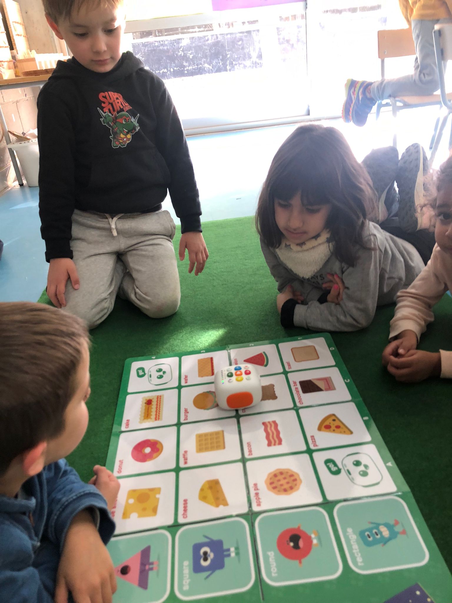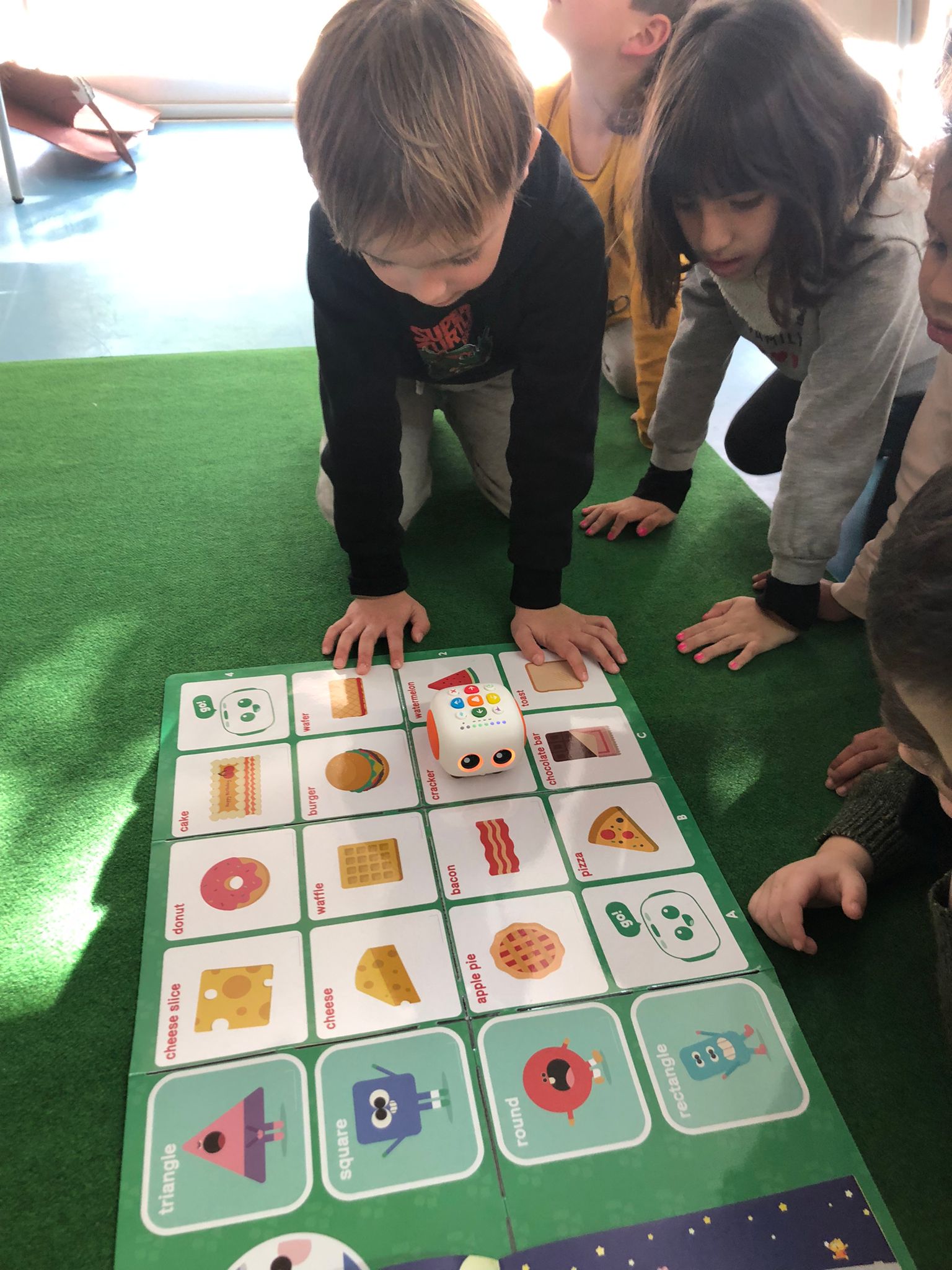 Avui hem fet la sessió d’anglès amb un robot, hem conegut en Tale-Bot! Hem après què pot fer, li dèiem els passos a fer, endavant, endarrere, girar, inclús ballar!! Que bé que ens ho hem passat! Hem buscat formes quadrades en anglès (square) i hem buscat diferents tipus de menjar que tinguessin aquesta forma. El “food” treballat ha estat: toast, cracker, waffle and cheese slice.