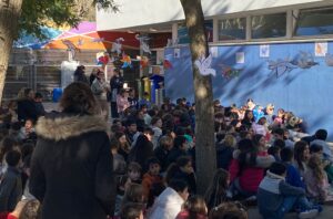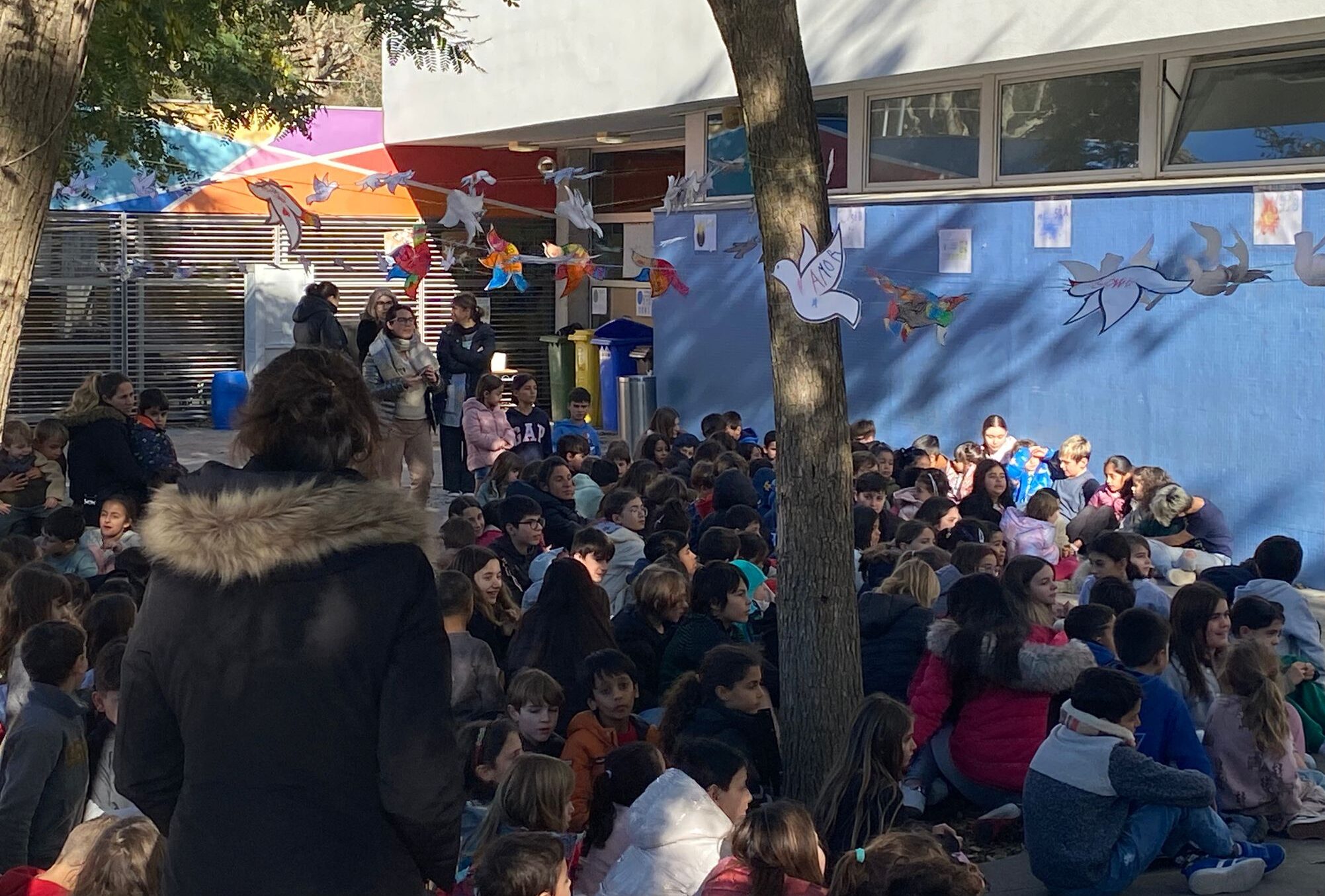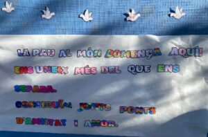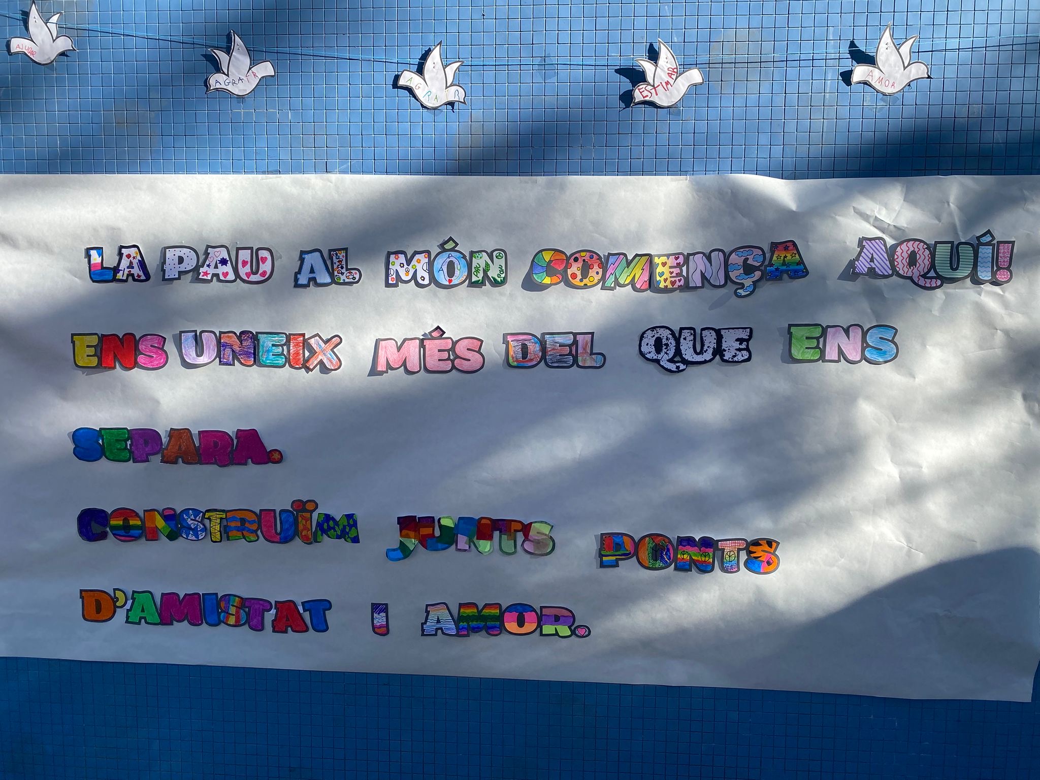 El passat 30 de gener els i les alumnes de l’escola Sobirans vam celebrar plegats el dia de la Pau. Prèviament, cada grup havíem parlat, reflexionat i treballat al respecte. També havíem pensat i triat paraules que defineixen el que és la pau i les vam escriure en coloms de paper que, posteriorment, vam penjar amb cordills als arbres del pati. El mateix dia de la pau ens vam unir per penjar les paraules del nostre manifest, el vam dir i vam cantar junts i juntes el “Swing de la Pau”.