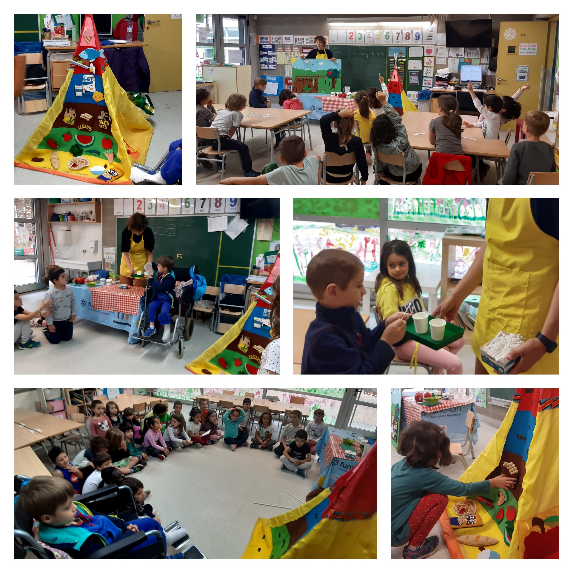 avui ha vingut la Mireia a parlar-nos sobre alimentació saludable. Ens ha explicat un conte sobre una iaia i la seva néta que tenien un hort i tot el que hi cultivaven… Després, entre tots i totes, hem anat posant diferents tipus de menjar a la piràmide dels aliments. Els de baix de tot són els que hem de menjar cada dia i els de dalt només de tant en tant! Finalment, hem tingut la sort (o no😣) de tastar el gust que té l’aigua amb sal i l’aigua amb sucre!