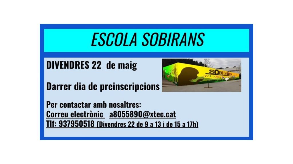 Informació actualitzada el 8/7/20 A totes aquelles famílies que heu fet la preinscripció a l’Escola Sobirans, DONAR-VOS LES GRÀCIES PER CONFIAR EN NOSALTRES! Aneu consultant la pàgina web on us anirem informant del calendari i dels enllaços amb els llistats perquè comproveu si tot el procés s’està fent correctament. També us farem arribar la informació