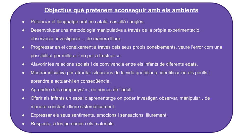 Com a escola, definim aquests tallers com a espais d’aprenentatge, de relació i comunicació on a partir de diferents propostes/activitats els infants poden actuar, observar, experimentar, construir, inventar, imaginar, compartir, relacionar-se, emocionar-se…i interactuar amb els altres. És una manera de poder donar resposta als interessos i necessitats dels infants i respectar els diferents ritmes d’aprenentatge.