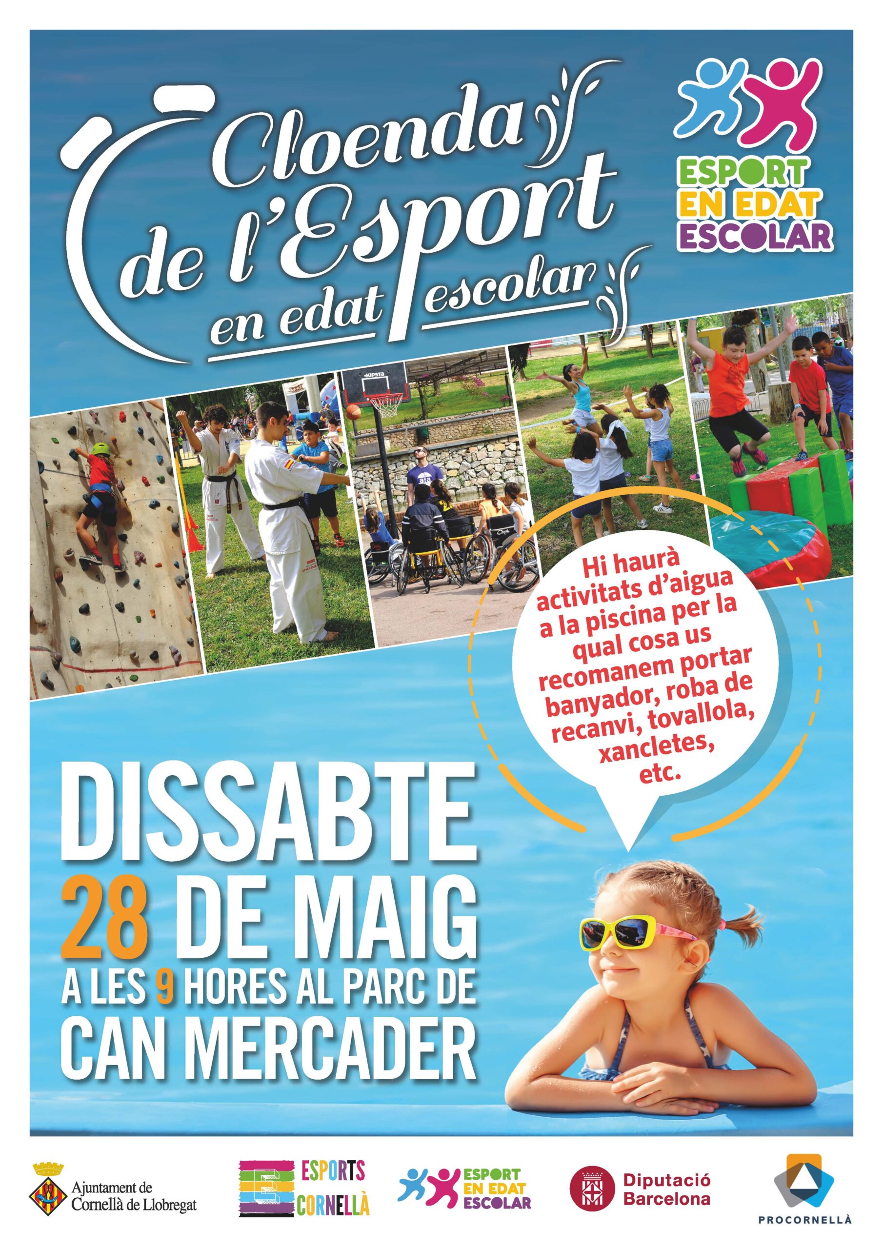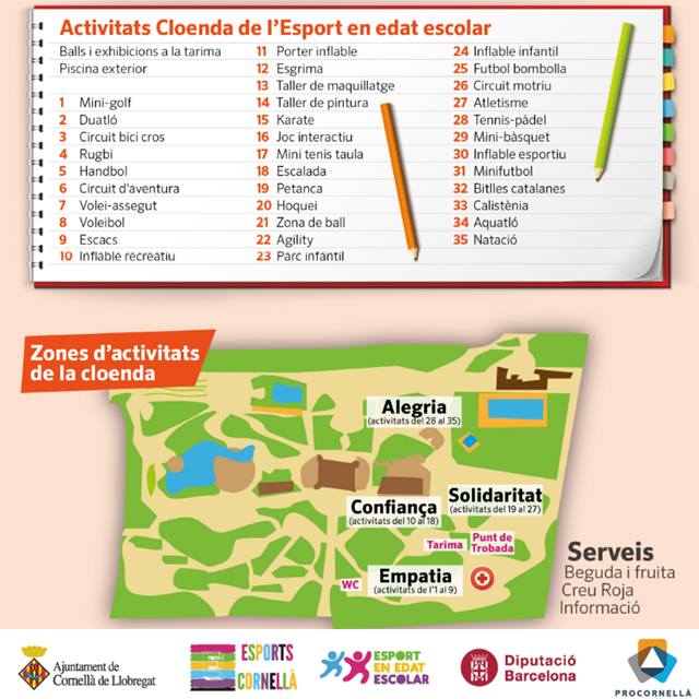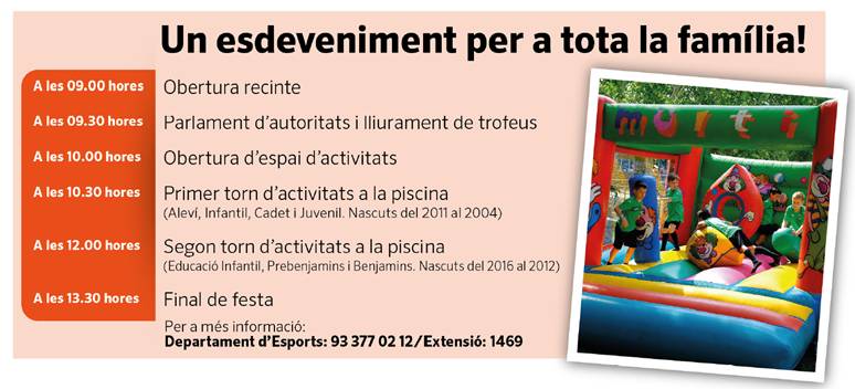 Un esdeveniment per a tota la família on podreu gaudir de 35 activitats lúdiques i esportives com voleibol, tennis, bàsquet, escalada… a més, hi haurà inflables i activitats per als i les més petits/es. També hi haurà activitats d’aigua a la piscina exterior, per la qual cosa us recomanem portar banyador, roba de recanvi, tovallola, xancletes, etc. (recordeu que a la piscina és obligatori que les persones menors d’edat vagin acompanyades del tutor/a o d’una persona responsable major d’edat).