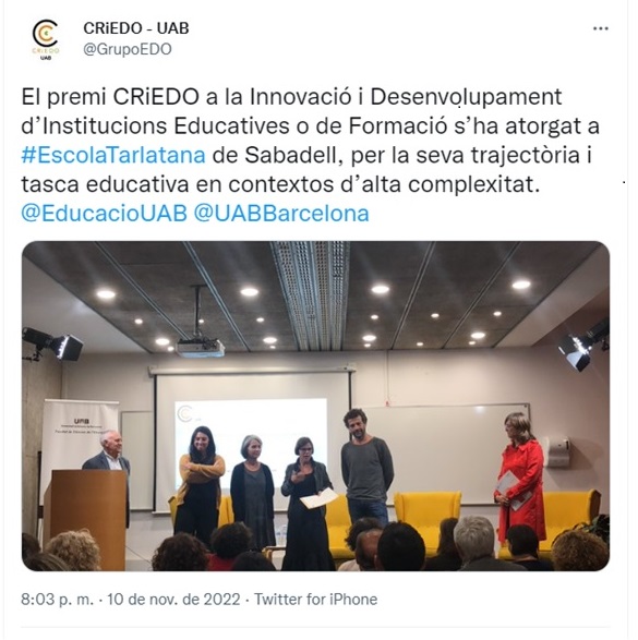 Ens fa il·lusió compartir amb vosaltres la notícia que ahir vam rebre el primer premi CRiEDO a la Innovació i Desenvolupament d’Institucions Educatives i de formació.