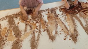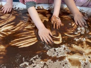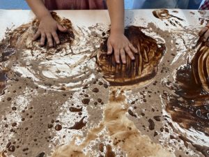 Hem jugat amb l’aigua i el cacau en pols per aconseguir una barreja ben bona. Hem gaudit d’aquesta experiència amb els cinc sentits! Hem comprovat la seva textura, l’hem observat, l’hem escampat, hem escoltat quin soroll feia en lliscar pel full i l’hem tastat… mmmm que bona estava la xocolata!