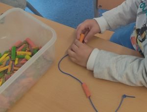 Racó d’art: Creem polseres amb els macarrons que van pintar en anteriors sessions.