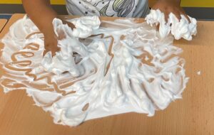 Racó de grafisme creatiu: en aquest racó les nenes i els nens s’han trobat amb espuma d’afaitar a la taula. En primer lloc, han manipulat i escampat l’espuma i, finalment, els hem proposat fer dibuix lliure, d’aquesta manera, van dominant el traç. Per tancar el racó, han netejat la taula.