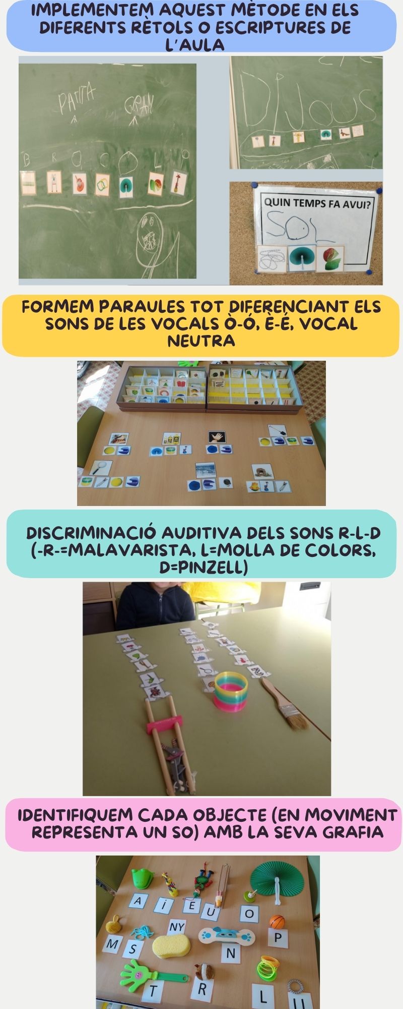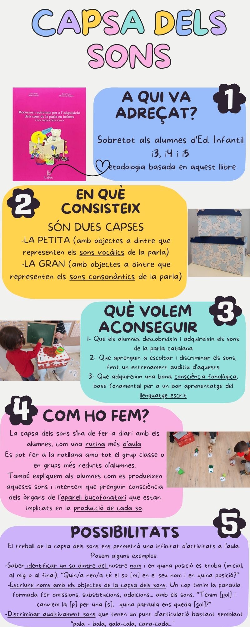 Aquesta setmana us presentem un petit resum del treball que fem, sobretot a Infantil, amb la capsa dels sons. Esperem que us agradi i que pugueu, a partir d’ara, conèixer una miqueta més aquest mètode per poder compartir amb els vostres fills estones de jocs on els sons i les paraules siguin els protagonistes.