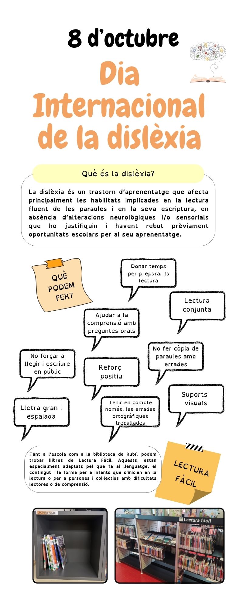 8 octubre. Dia Internacional de la dislèxiaPer Comunitat de Grans / 8 d'octubre de 2024 / General Portada Bon dia! Avui, 8 d’octubre, és el Dia Internacional de la dislèxia. A continuació, us deixem una infografia que us ajudarà a conèixer una mica més què és i què podem fer per ajudar a aquests infants. Gràcies