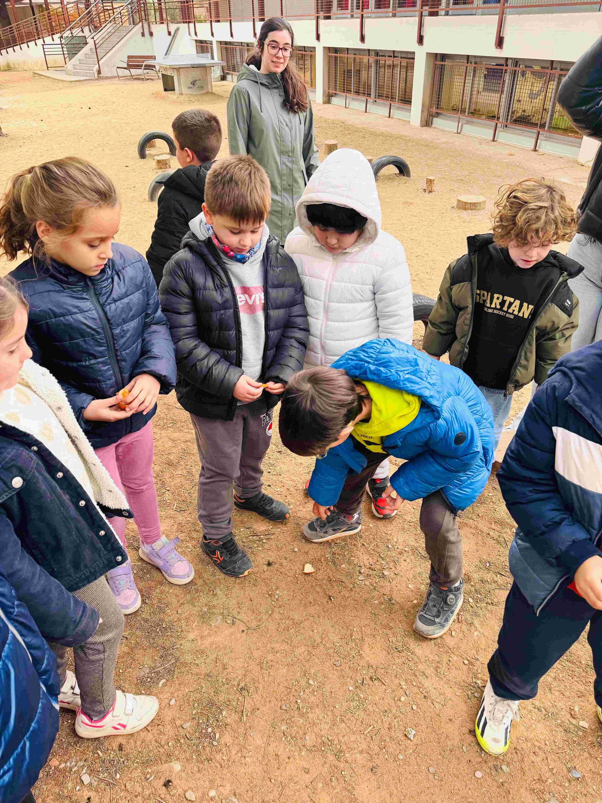Un dels moments més especials ha estat l’arribada del Tió. Seguint el rastre de mandarina que ens havia deixat, els infants l’han pogut trobar al bosquet de l’escola, enmig d’una escena plena d’emoció i rialles.