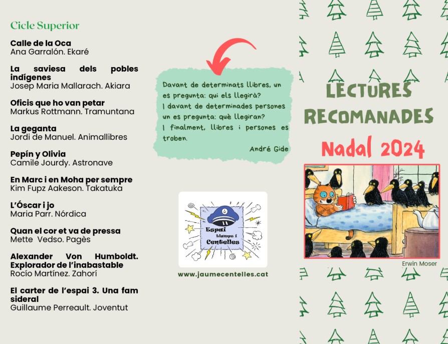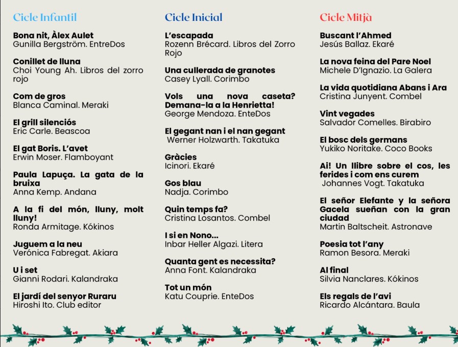 Des de la Comissió de Biblioteca volem facilitar-vos un llistat de lectures recomanades per aquestes festes de Nadal. Estan indicades des de Cicle Infantil fins a Cicle Superior.