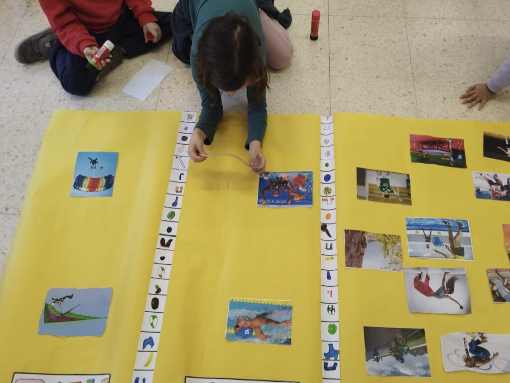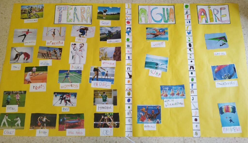 La classe dels esports seguim treballant en el nostre projecte d’aula i hem elaborat un mural amb la classificació dels esports que coneixem en funció d’on es practica: terra, aigua o aire. Ara estem preparant unes exposicions on cada infant es convertirà en “expert” de l’esport que ha triat i farà una breu exposició oral als seus companys i companyes.