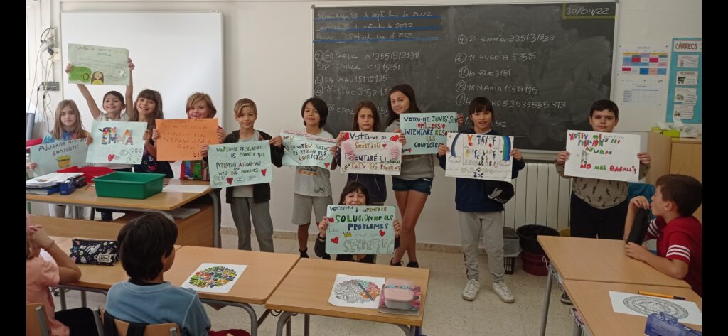 Una altra acció important ha estar votar quins seran els nostres delegats/des i secretaris/es al llarg del curs. Cada candidat/a ha elaborat un cartell electoral i ha pronunciat un breu discurs per convèncer als companys/es de donar el seu vot. Ha estat un èxit de participació ja que s’han presentat 11 canditats i candidates!!