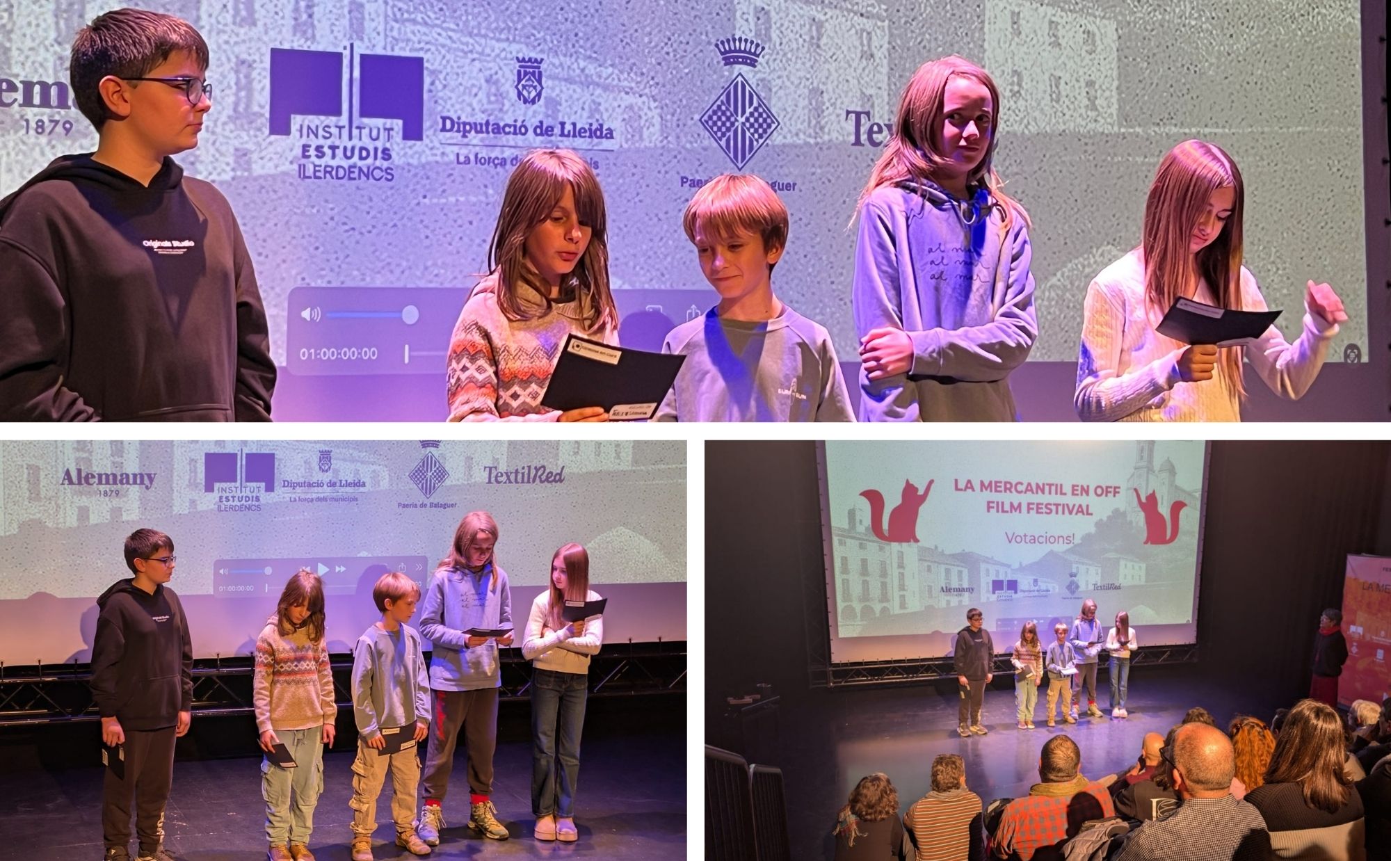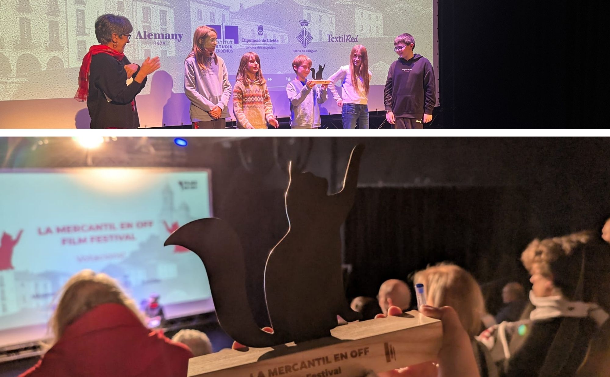 La presentació també va tenir un moment molt especial i inesperat: un cop visualitzat el curt, la Rosa Andreu, encarregada de presentar tot l’acte, va convidar l’equip a restar a l’escenari. En aquell moment, va fer entrega d’un premi que va esdevenir un gest ple de reconeixement, orgull i agraïment per tota la feina feta. Va ser una sorpresa molt emotiva que va donar encara més sentit i valor a tot el procés viscut.