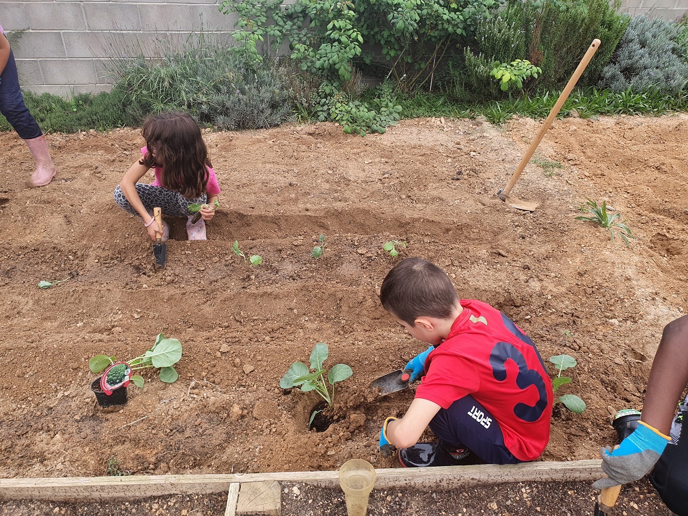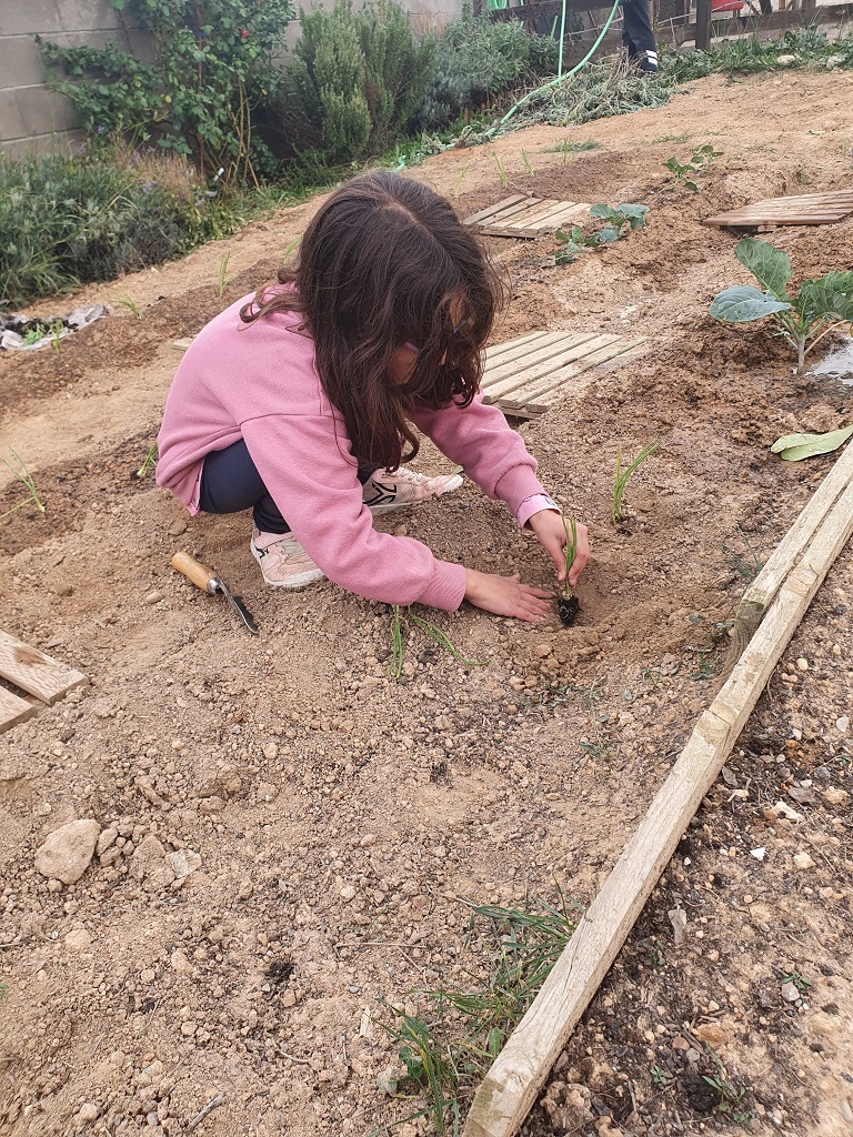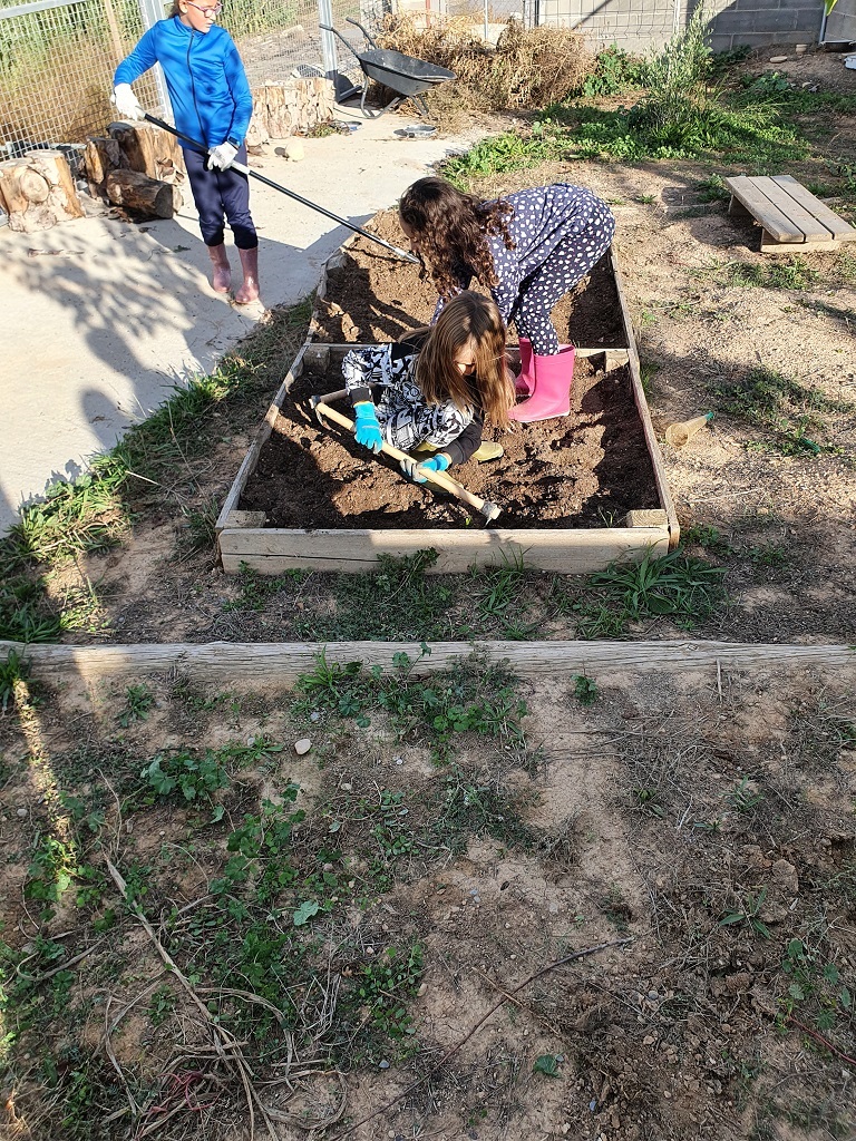 Els infants de 3r i 4t curs han estat treballant a l’hort des del mes de setembre per tal que estigui llest per a plantar-hi i sembrar-hi. Han fet molta feina! Han arrencat les males herbes, han remogut la terra, hi han afegit fem, etc… També han mesurat i dibuixat l’hort. I a més, els nens i les nenes han arreglat les jardineres de la caseta plantant-hi pensaments i ciclamens.
