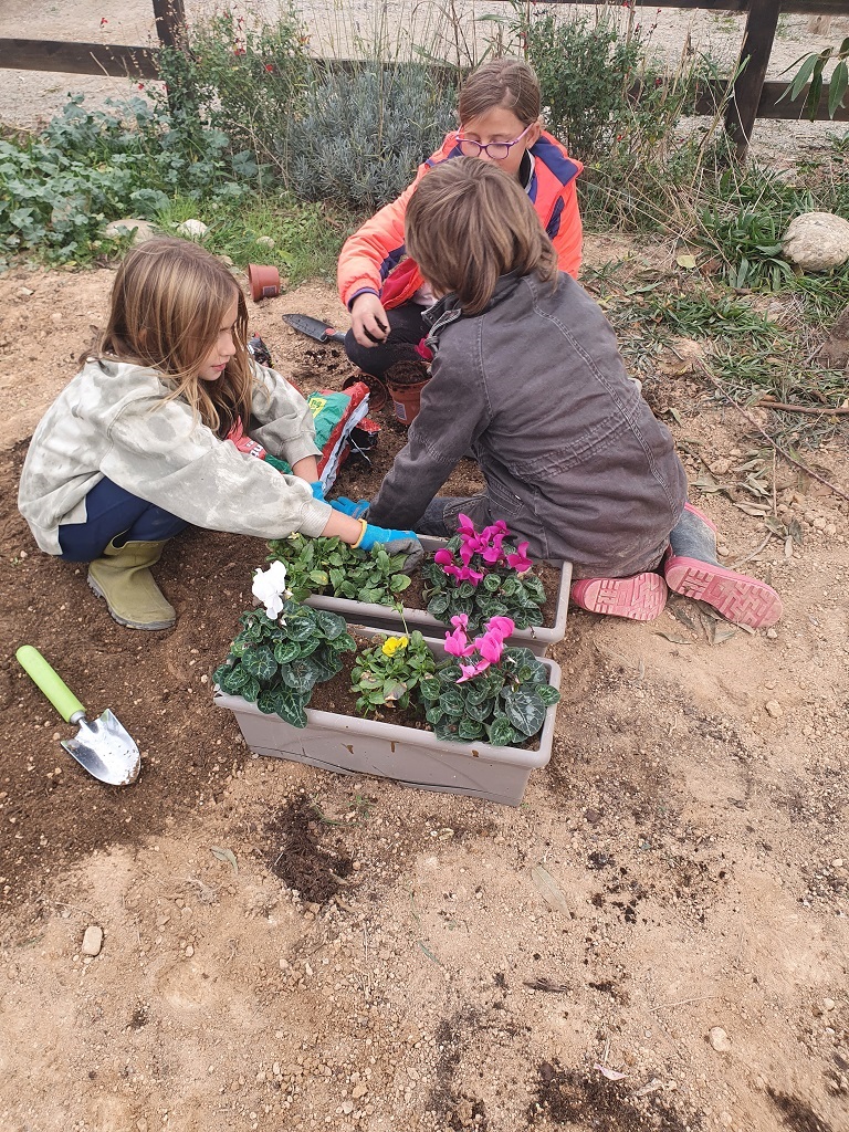 Children from 3rd and 4th grade have been working in the vegetable garden since September to get it ready for planting and sowing. They have done lot of work! They pulled the weeds, removed the soil, added manure, etc… They also measured and drew the garden. Boys and girls planted flowers in the cottage planters too: pansies and cyclamens.