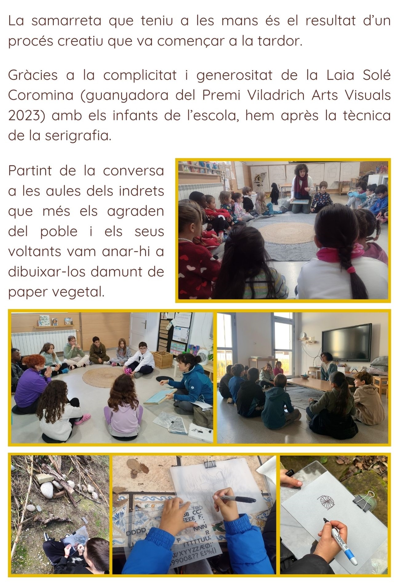 L’últim dia del trimestre els nens i nenes es van emportar cap a casa les samarretes que han fet a l’escola amb la Laia del Viladrich. Uns dies abans vam anar a fer-nos fotos tota l’escola junts!