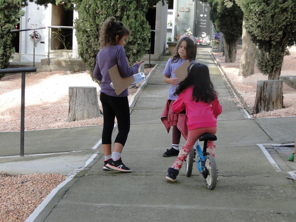 La primera vegada, cadascú havia de fixar-se per on passàvem perquè després, a l’aula, n’havien de fer un mapa. Quan vam ser allà, els infants hi van accedir amb respectes i ens vam dedicar a llegir les làpides. L’objectiu era buscar noms que comencessin amb la nostra inicial. Vam fer lectura, vam imaginar històries, vam buscar coincidències, vam veure moltes dates… ens vam adonar que hi tornaríem a anar.