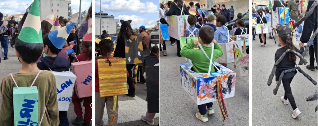 Divendres al matí, amb l’ajuda d’algunes famílies, vam fer un tallers al pati de l’escola on l’alumnat podia moure’s lliurement i realitzar els que més els agradés. N’hi havia de maquillatge, pentinats, màscares… Finalment, a la tarda, vam fer una rua pels carrers del voltant de l’escola disfressats segons el nostre projecte d’aula.