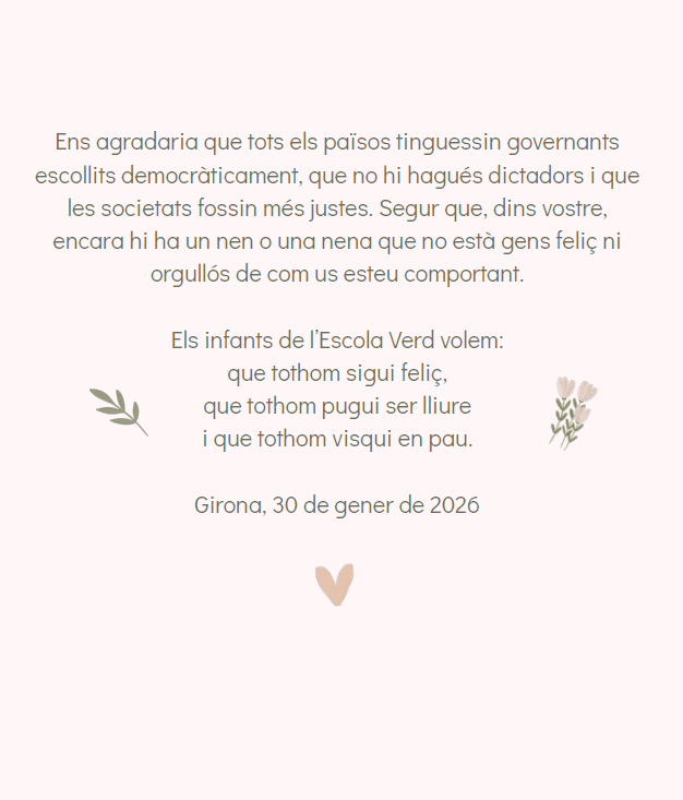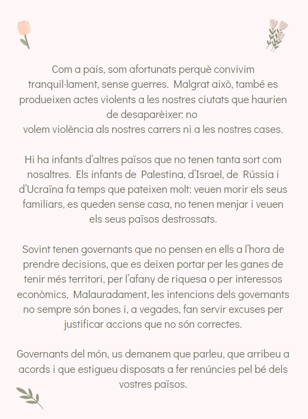Aquests dies hem estat preparant a l’escola el DENIP Dia Escolar de la No-Violència i la Pau. Hem parlant molt sobre la pau a les tutories i hem fet també Murals de Pau. Paral·lelament, el Consell d’Alumnes ha preparat un manifest que ha llegit aquesta tarda en un acte davant de tota l’escola.
