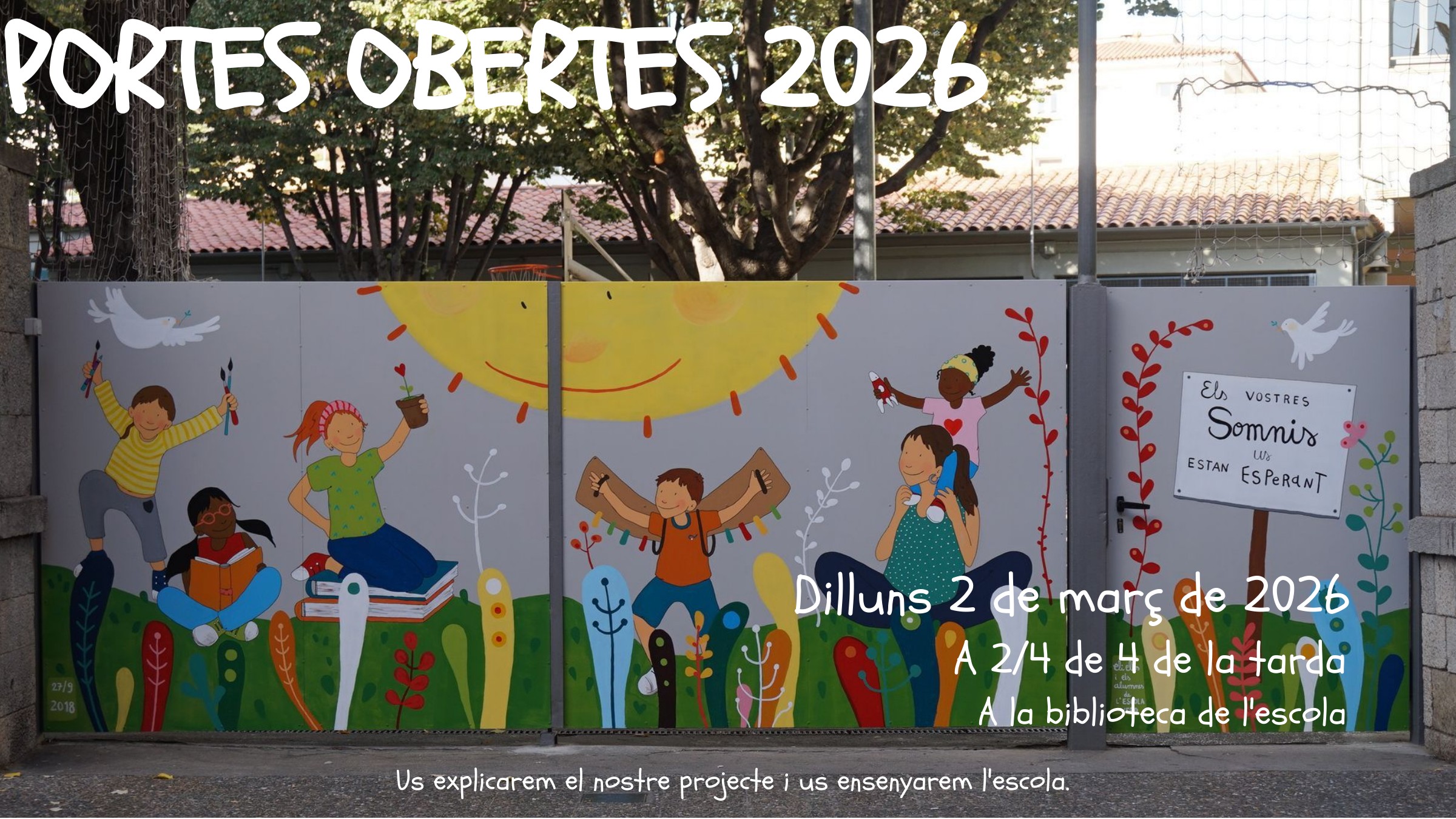 Jornada de portes obertes 2026 Feu un comentari / Per admin / 29 de gener de 2026 / Famílies General Portada Ja tenim data per a la Jornada de Portes Obertes d’enguany. Serà el dilluns 2 de març a 2/4 de 4 de la tarda. Si ens voleu venir a conèixer estarem encantats d’explicar-vos el nostre projecte i ensenyar-vos l’escola.