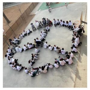 A la tarda, tots junts, alumnat i professionals hem sortit al pati per a fer el símbol de la Pau.