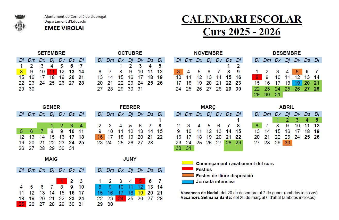 L’horari lectiu del centre és de 9 a 12:30 h i de 15:00 a 16:30 h per a tots els alumnes del centre. El dia 21 de desembre de 2024 i a partir del 10 de juny de 2025 es realitza horari compactat de 9 a 13:00h. (Els alumnes que utilitzen el servei de menjador surten a les 15:00h.)