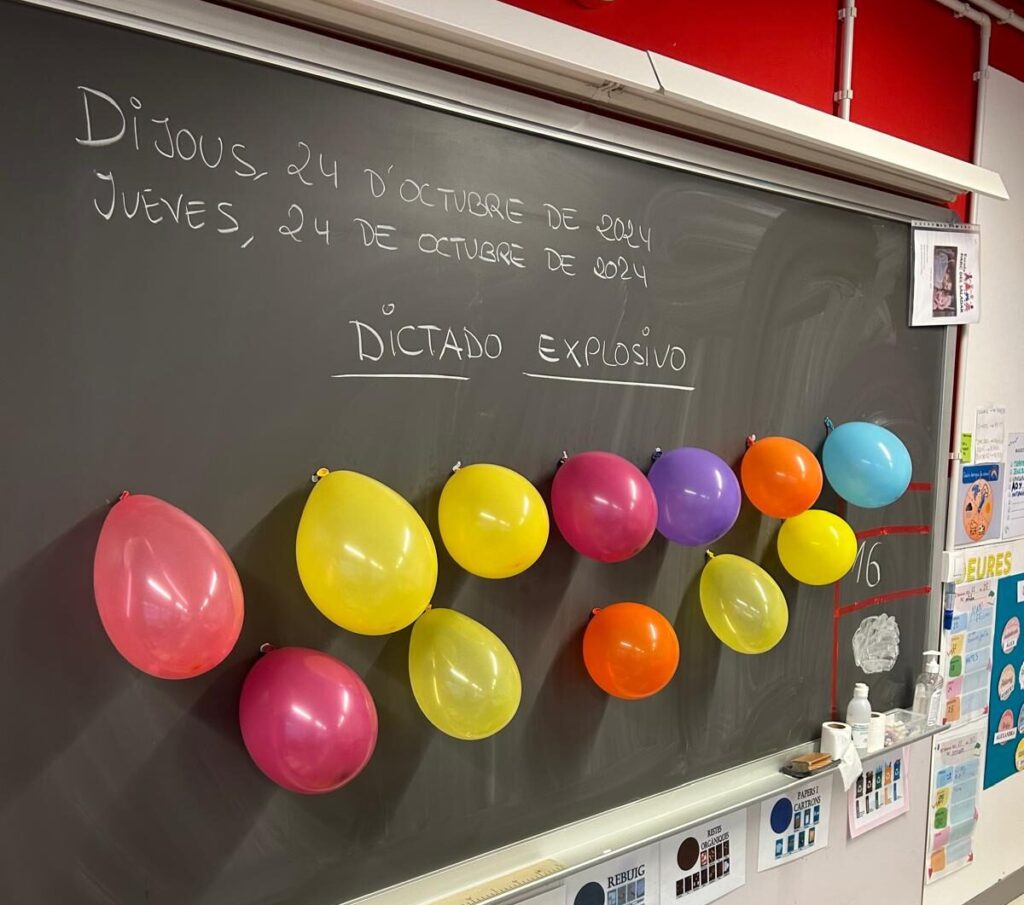 La setmana passada vam iniciar una sèrie de dictats força especials, dictats explosius. L’alumnat triava un globus per a petar-lo i llegia la paraula que en sortia i els companys i companyes l’escrivien. Què bé que ens ho vam passar! Si cliqueu la imatge, us podem ensenyar un petit vídeo d’algun dels moments del dictat