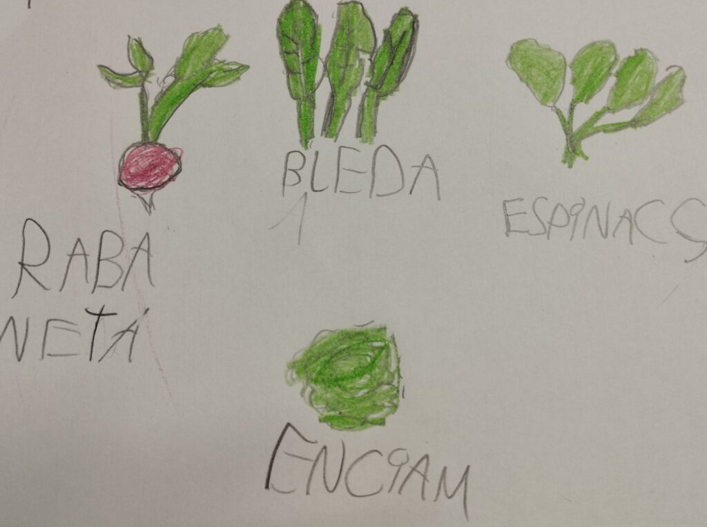 Un cop vam tornar a l’escola després de vacances, de dies de vent, pluja… vam poder anar a l’hort i la nostra sorpresa va ser observar que el que havíem plantat havia crescut: bledes, bròquils, enciams… i també les males herbes! Vam collir alguna bleda, raves i espinacs, ho vam dibuixar i vam fer un