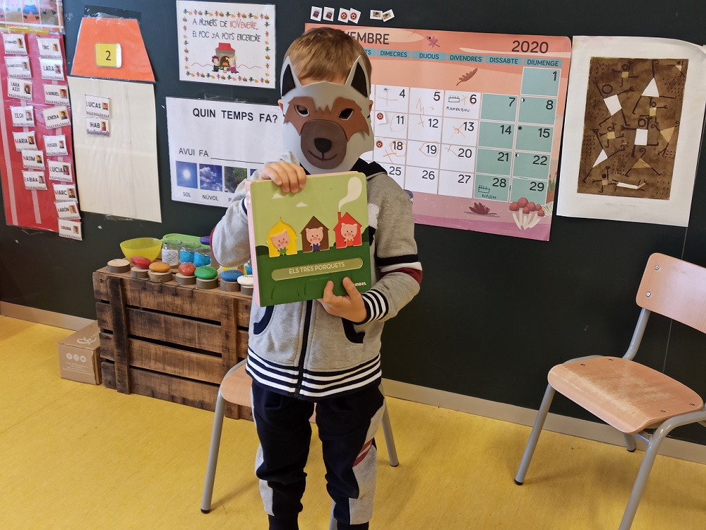 Ha vingut amb una màscara de llop ferotge, i ha fet servir un conte molt bonic per ajudar-se.