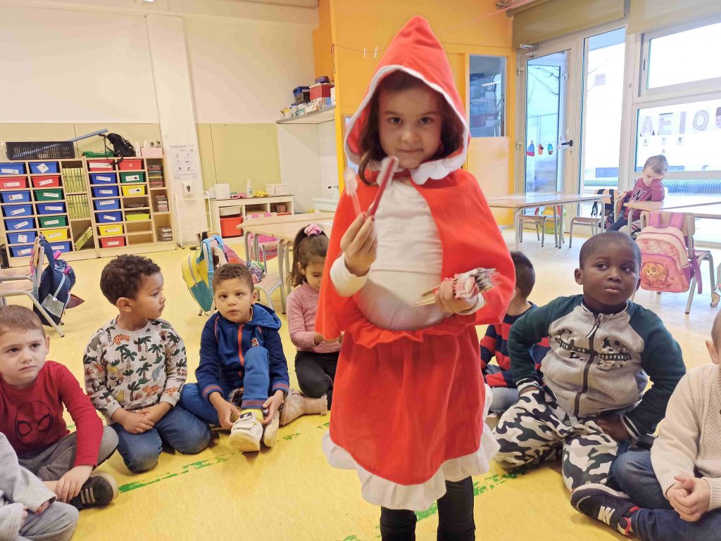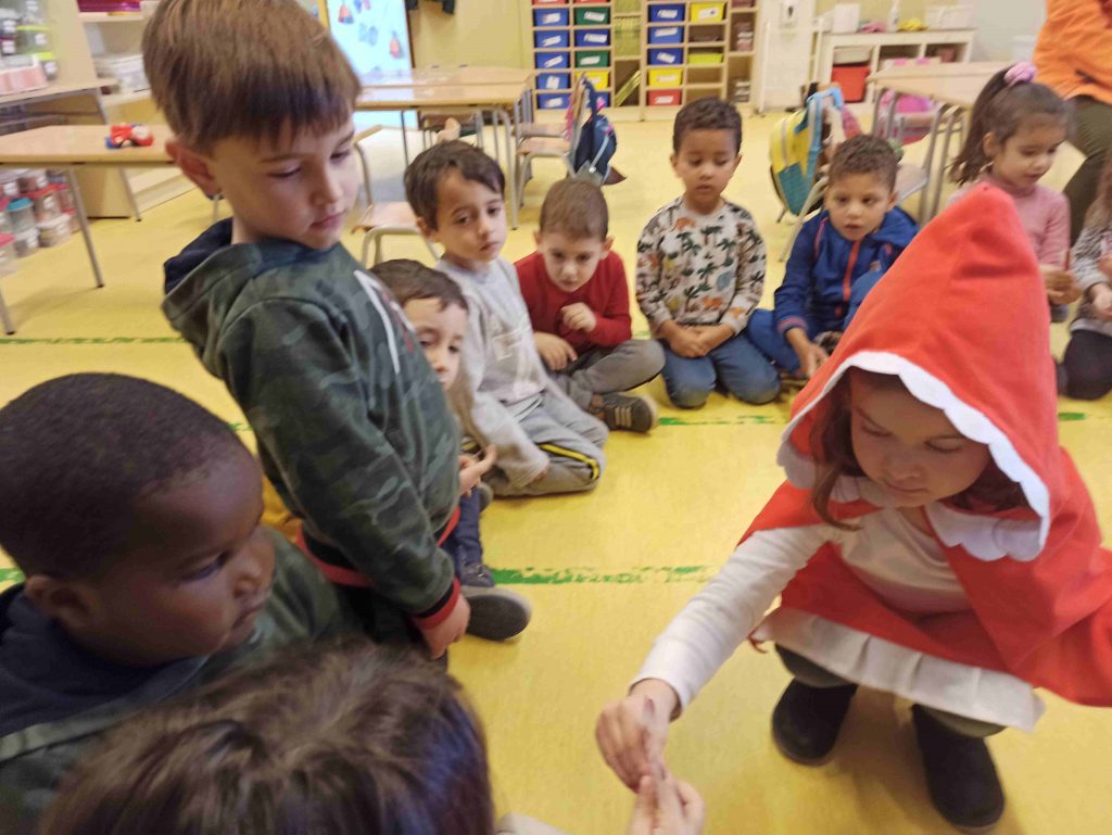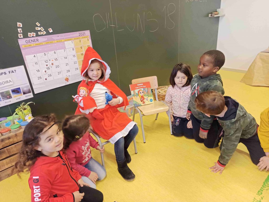Avui la Maria tota guapa disfressada ens ha explicat el conte de “La Caputxeta Vermella”. Ho ha fet súper bé, es sabia el conte de memòria. Ha portat tres titelles i ens ha ajudat a entendre millor el conte.